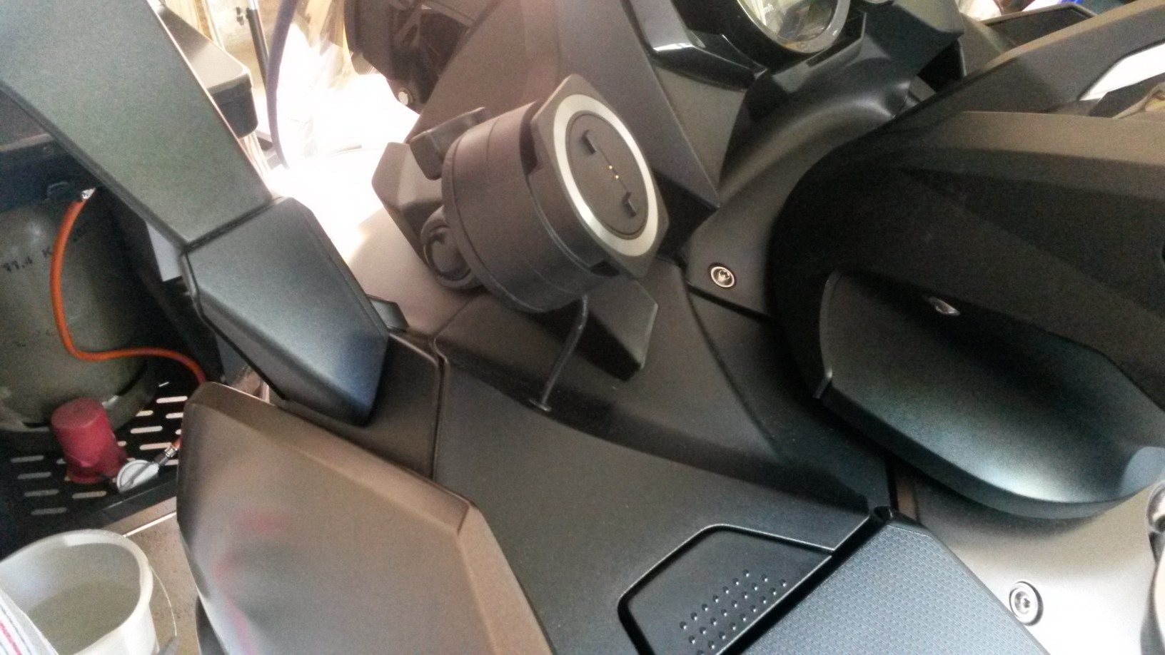 Strom ziehe ich, wie beschrieben, über den Stecker, der unter dem BMW-Emblem im Lenker sich befindet. Dieser ist mit der Zündung verbunden. Also nicht aus der Steckdose des linken Faches.