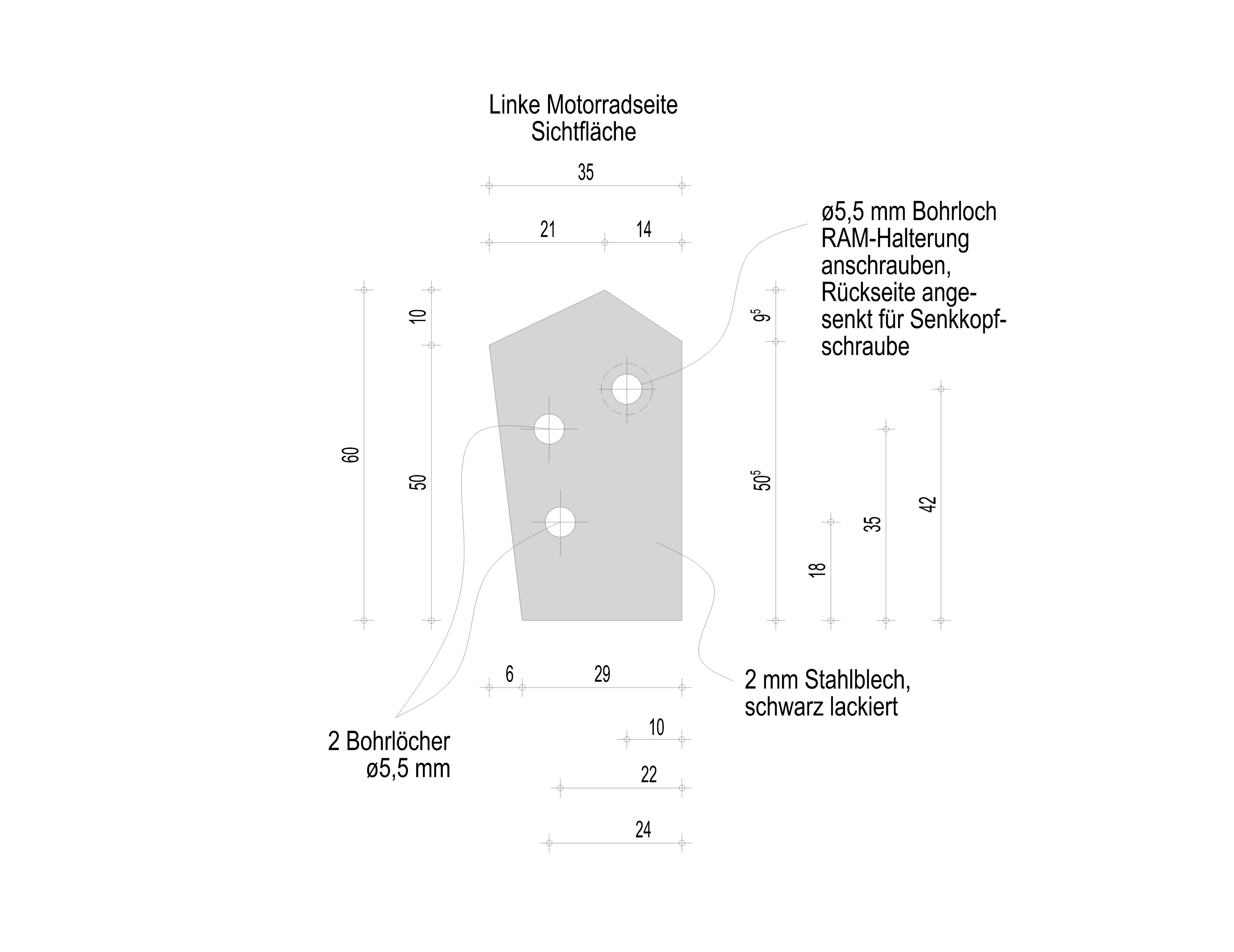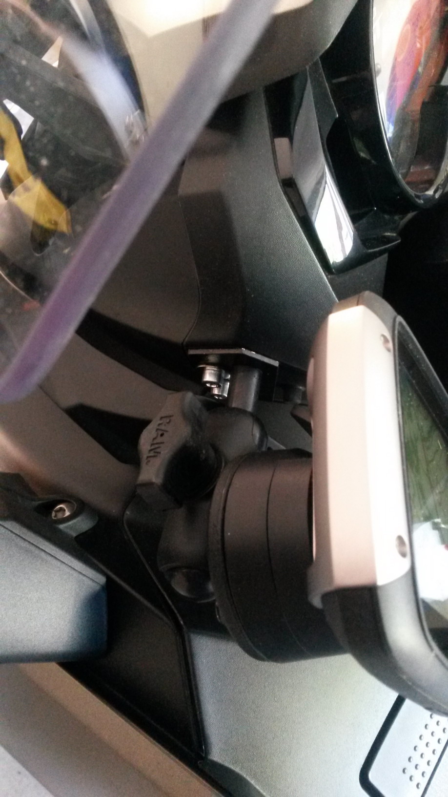 Unter den beiden Seitenwindflügelchen befinden sich 2 Schrauben, die die Instrumentenverkleidung befestigt. An dieser Stelle ist die Halterung positioniert. Ein erster Versuch an nur einer Schraube die RAM-Halterung anzuschrauben brachte nicht den gewünschten Erfolg, da das Gewicht und der Hebelarm zu groß war und das ganze System mir viel zu sehr wackelte. Die Kraftübertragung auf die Kleine Zylinderfläche der RAM-Halterung war einfach zu groß. Also habe ich mir eine 2 mm Stahlblechplatte mir vom Schlosser meines Vertrauens „schnitzen“ lassen mit 2 Bohrungen. So wir die Kraft aus dem Hebelarm mit Gewicht Navi wesentlich besser verteilt. Ursprünglich wollte ich die RAM-Halterung am Zylinderschaft abschrägen und an die Stahlplatte schweißen lassen. Da es sich aber um 2 verschiedene Materialien handelt, schied eine Verschweißung aus. Wir haben dann eine weitere Bohrung mit einer kegelförmigen Senkung vorgenommen, so dass die Senkkopfschraube von hinten flächenbündig mit der Stahlplatte ist. RAM-Halterung an die Platte geschraubt, Originalschrauben raus, Platte mit RAM-Halterung mittels 2 Innensechskantschrauben angeschraubt und fertig ist die Halterung. Anschl. das TomTom-Kabel gekappt, Kabel durch die Verkleidung geführt und mit dem im Lenker befindlichen Anschluss verbunden.