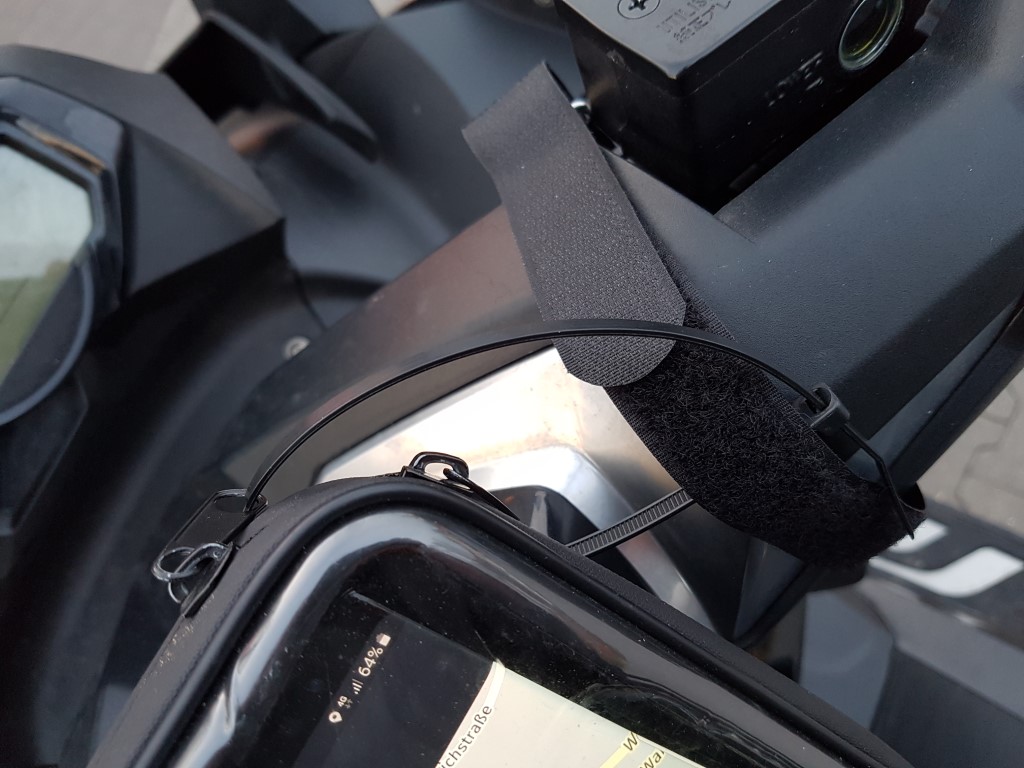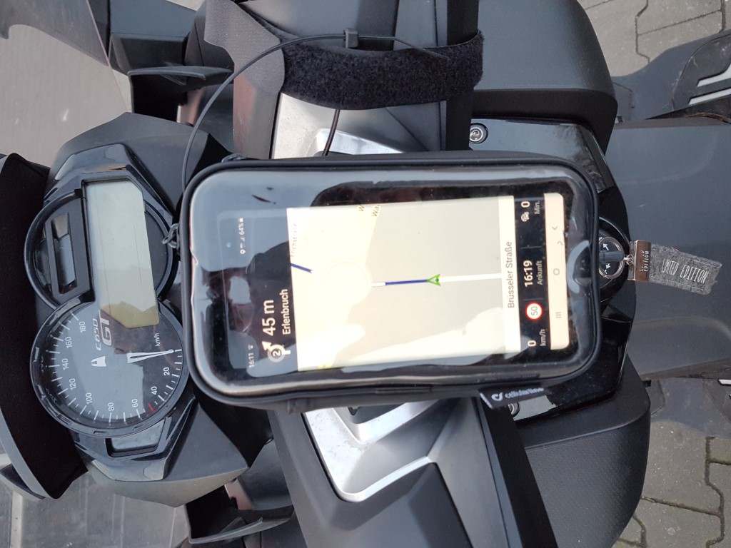 Ich navigiere mit dem Smartphone und hatte dafür auf meiner F 800 GT eine wasserdichte Schutztasche mit Klick-Verbindung auf der Halterung des Freundlichen montiert.