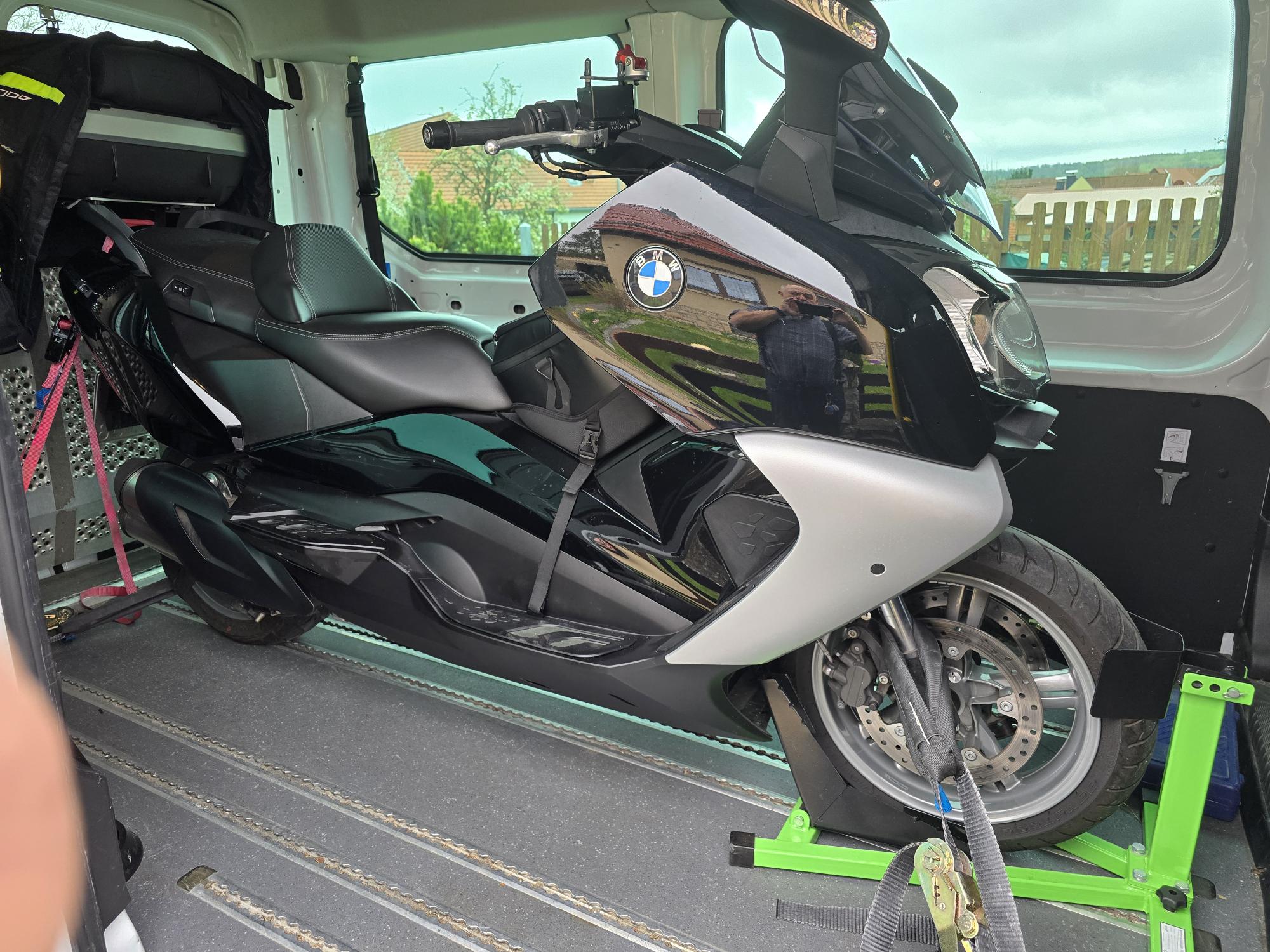 Ich verbaue auf dem Anhänger vor dem Transport des Rollers eine Vorderradwippe (4 Schrauben), das hält den Roller zumindest soweit, um ihn hinten sicher verzurren zu können.