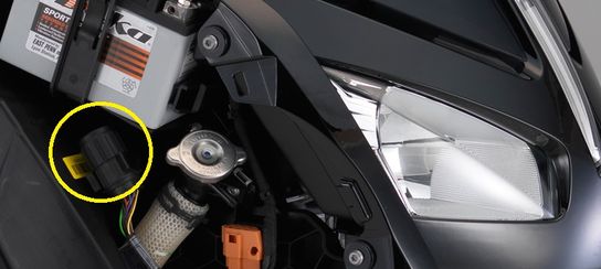 Rechts vorn hinter der Verkleidung verborgen direkt unter der Batterie.