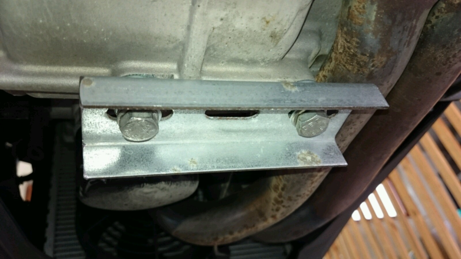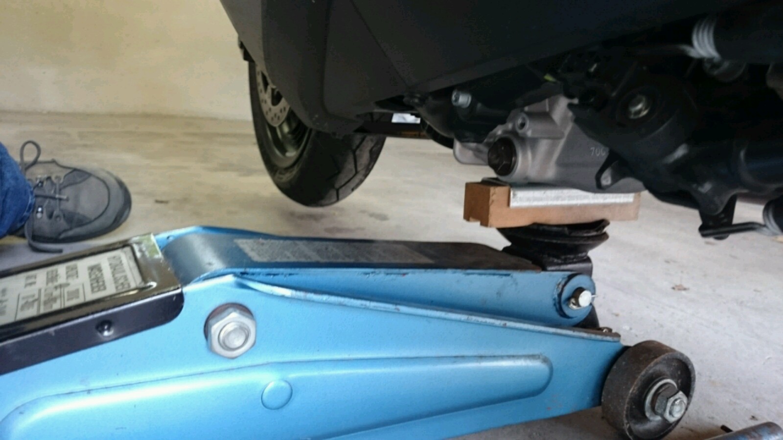 unten am Motorblock sind drei, mit Gummistopfen abdeckte, Befestigungsstellen. Dort wird eine dreieckige Metallplatte verschraubt. An dieser kann der Roller vorne mit einem Wagenheber aufgebockt werden. Das Ganze ist sehr stabil und das Rad kann jetzt leicht ab- und angebaut werden.