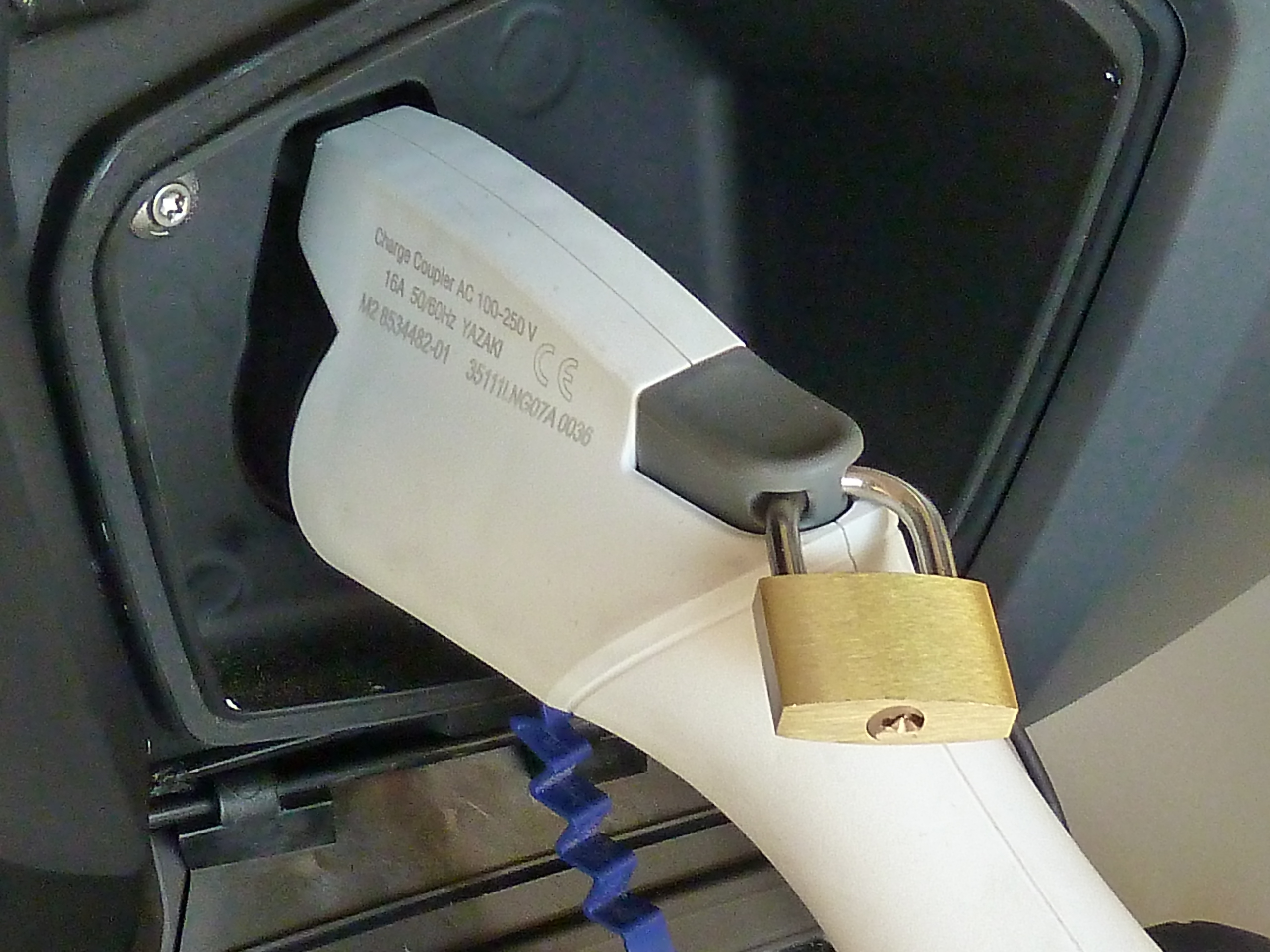 Es gibt zahlreiche Vorhängeschlösser mit Bügel der Stärke 3,0 und 5,0 mm. Für ein 5 mm Schloss ist das Loch im Stecker zu klein. Bei Schlössern < 4mm läßt sich der Stecker dennoch abziehen. Ich habe im örtlichen Sonderpreis-Baumarkt ein NoName-Schloss für 1,50 € gefunden, das mit 4,5 mm seinen Zweck erfüllt. Das Schloss hat sicher nicht die Qualität eines Markenschlosses, aber es wird zumindest Gelegenheitsdiebe abhalten, da sich der Stecker nun nicht mehr ohne weiteres abziehen läßt. Klar, gegen den Einsatz von Gewalt und Werkzeug reicht diese Lösung nicht.