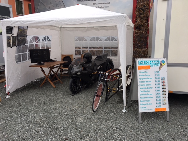 Rechts von mir stand ein Eiswagen, der sage und schreibe 9 Eis an den zwei Messetagen verkauft hatte und links von mir war ein Solarmodulverkäufer.