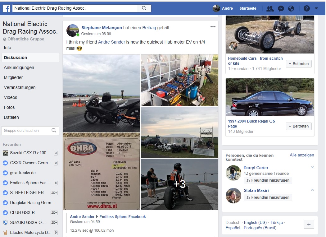 Laut einem Mitglied von der NEDRA (National Electrical Dragracing Association) habe ich wohl derzeit das schnellste EV (electrical vehice) mit Radnabenmotor auf der 1/4 Meile!