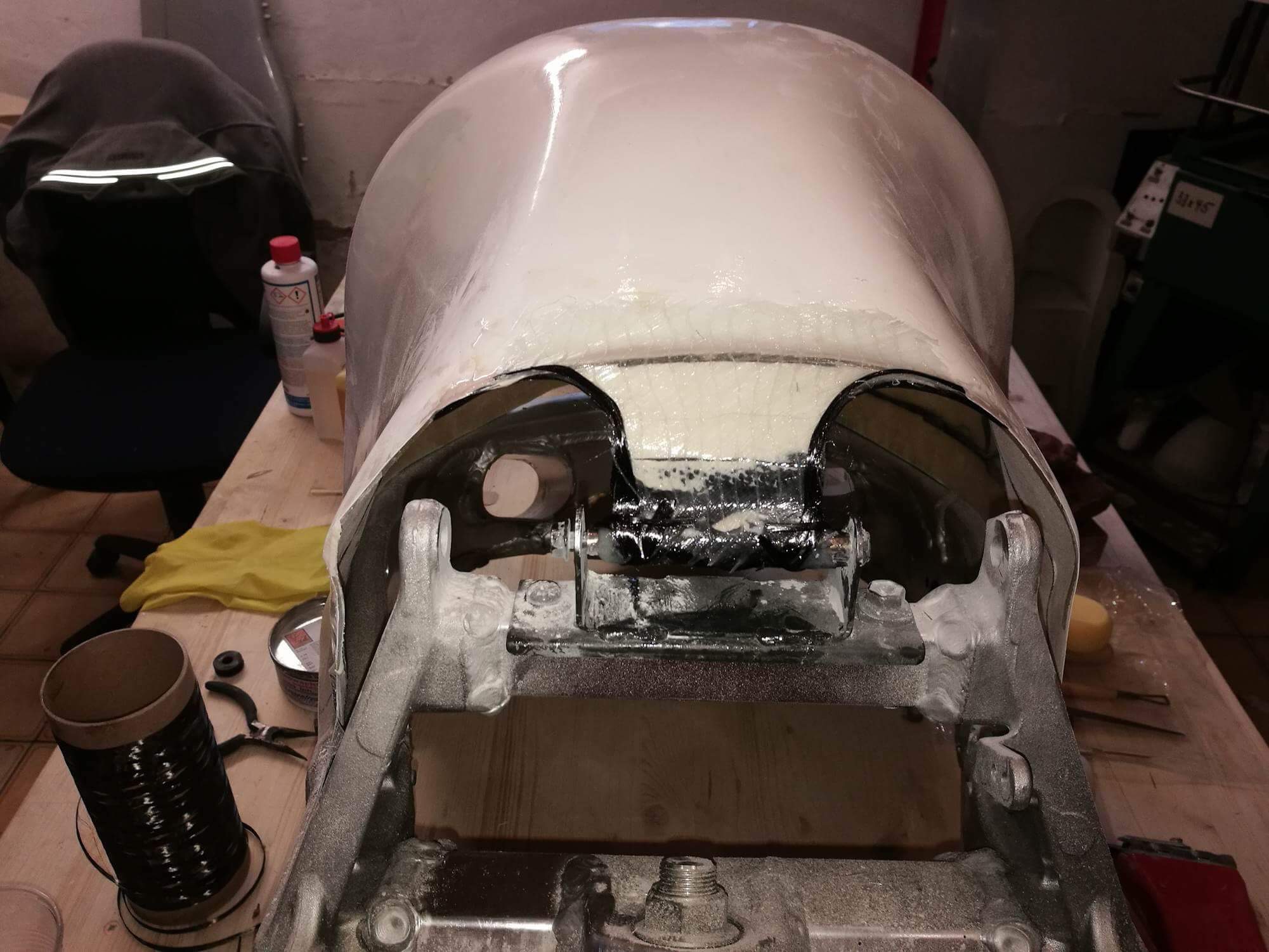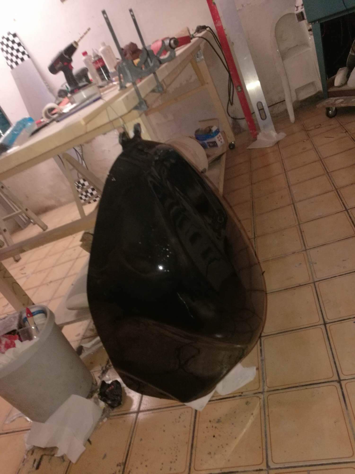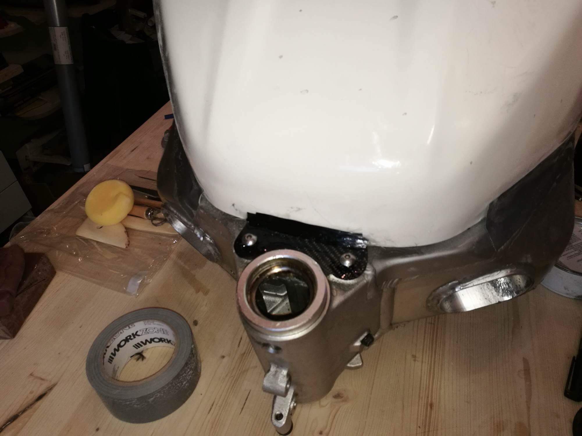 Damit es nicht weiß durch die Carbonmaatte durschimmert, wurde die GFK-Tankattrappe kurzerhand Schwarz lackiert.