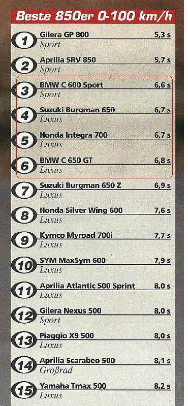 Lt. einem Vergleichstest in Motorrad (C600Sport, Integra mit 670ccm, 52PS, T-Max) wurden folgende Werte gemessen: