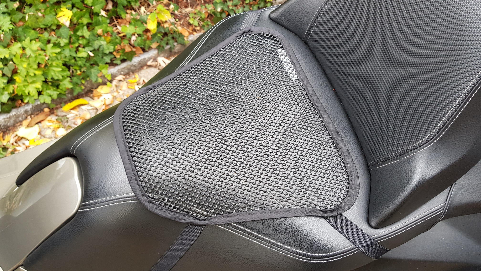 Gegen das Rutschen habe ich zur Zeit ein Antirutschnetz auf dem Sitz befestigt. Nun läuft aber das Wasser zusätzlich entlang den Elastikgurten ins Helmfach