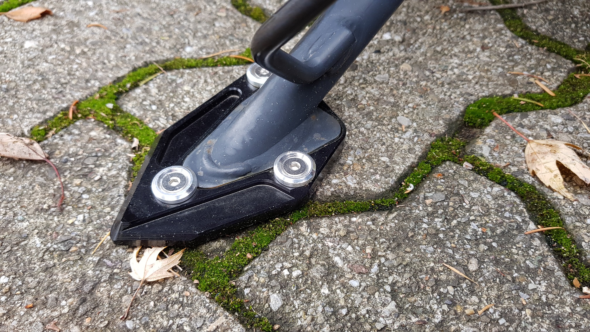Wegen dem Ständerproblem habe ich auch noch die Fussverbreiterung montiert, damit der GT steiler steht und der Seitenständer weniger belastet wird!