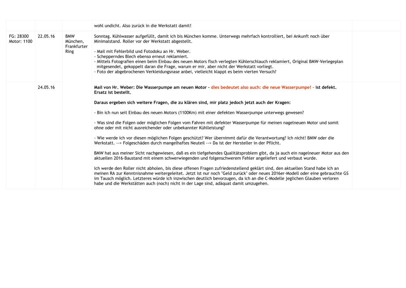Baustandes (den ja sonst ein anderer Kunde bekommen hätte), um einen mehr als ausreichend geschundenen Kunden endlich angemessen zu bedienen. Und dieses Teil enthält einen schwerwiegenden Fehler, eine defekte Wasserpumpe.
