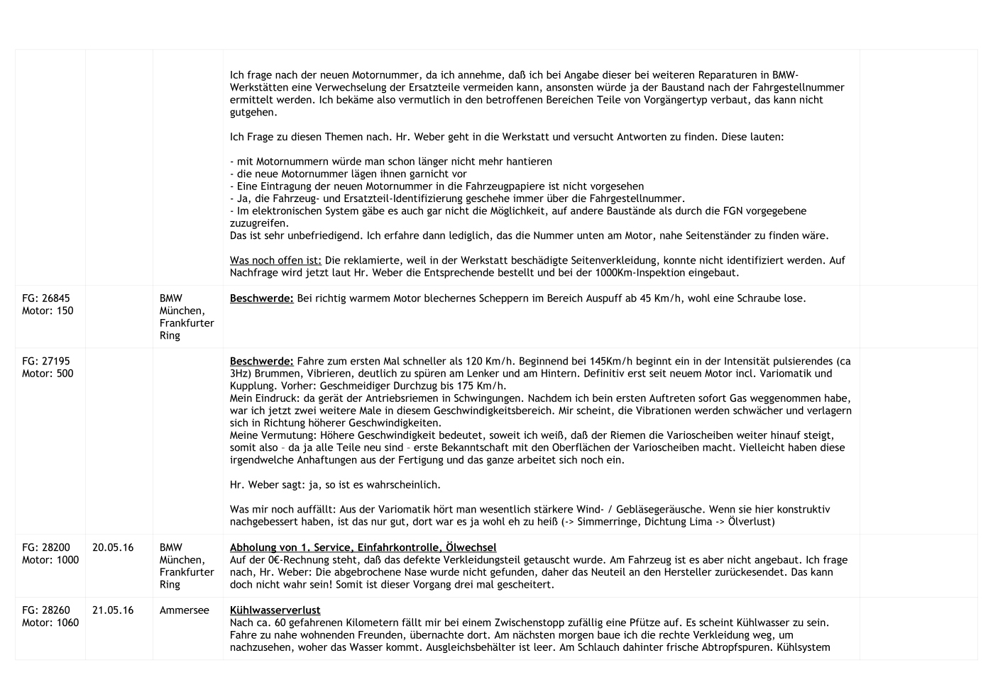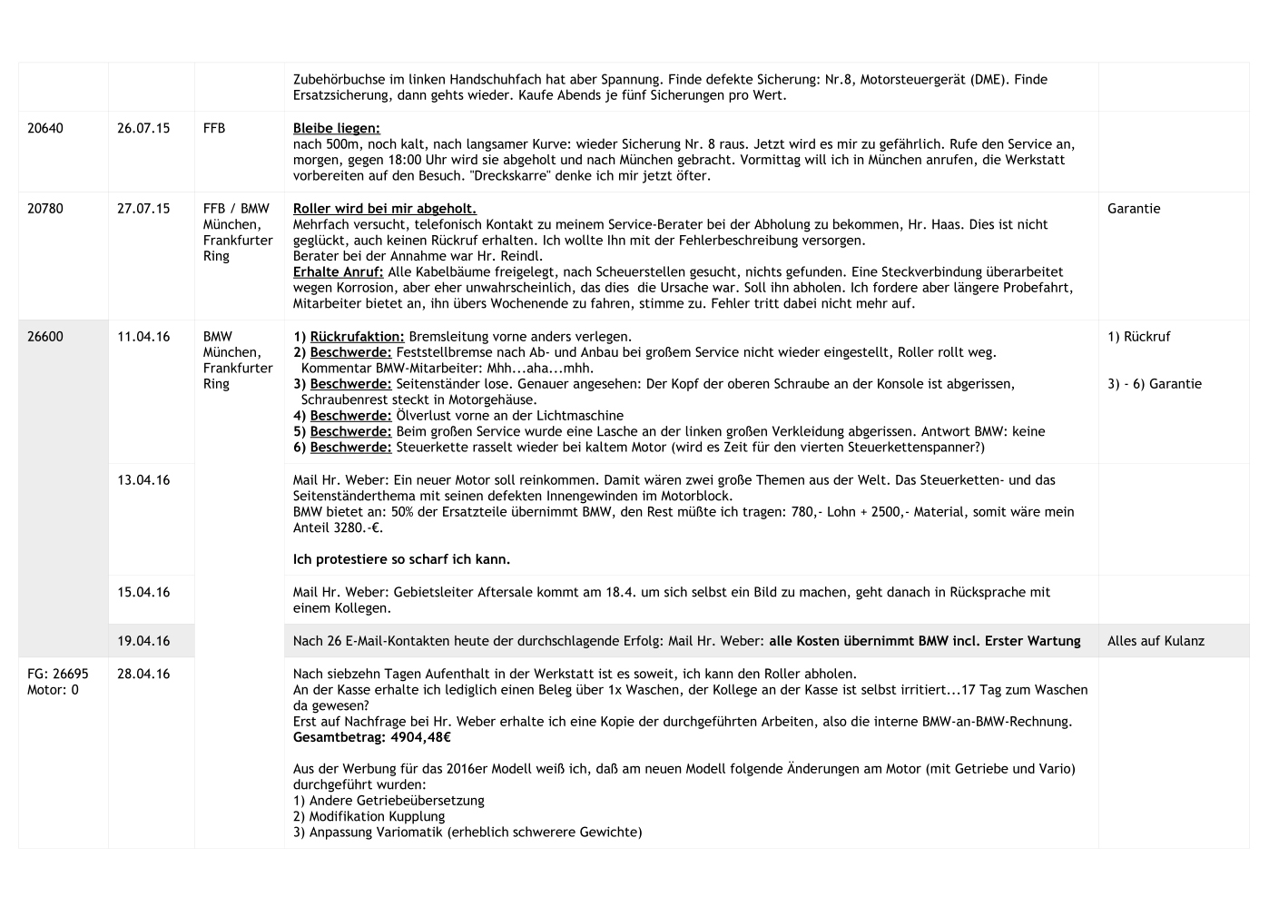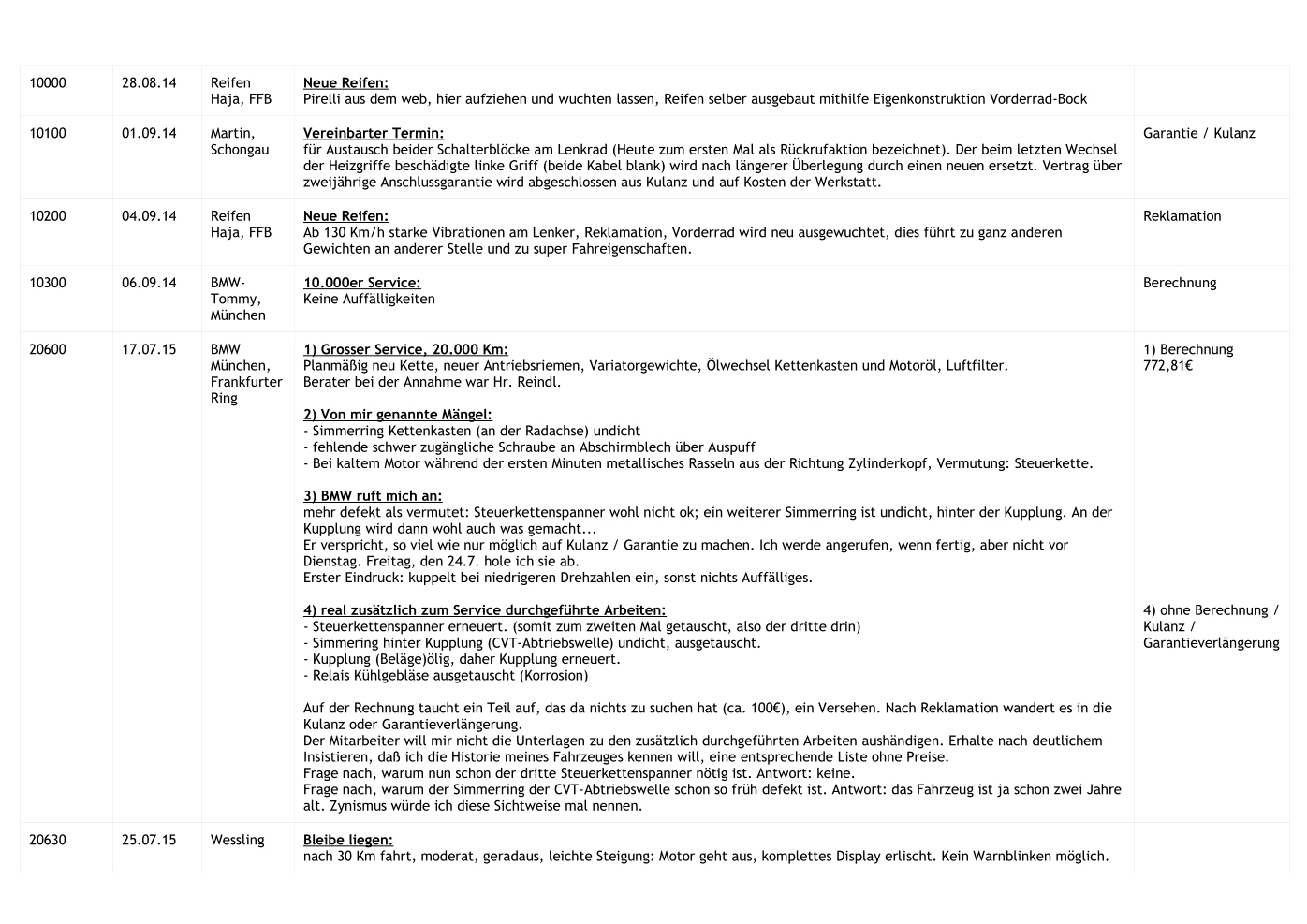 Ich habe unfallbedingt schon die Zweite 650 Gt. Mit der Ersten 26.ooo Km gefahren , außer Inspektion u. werksmäßigen Rückruf keinerlei Beschwerden . Mit der 2.ten Maschine, außer 3 maliger Einbestellung in die Vertragswerkstatt ZTK / Schneverdingen , welche das Aufleuchten des roten Warndreiecks ab 160 km/h zum Anlass war( bis heute wurde mir nicht gesagt , was es denn nun wirklich war ), hatte ich toi , toi keine weiteren Schwierigkeiten ! ( Rückruf Bremsschläuche wurde gleich mitgemacht ) Ich befürchte auch , das bei Dir einige Werkstattfehler vorliegen ! Leider ist das Servicenetz sehr ausgedünnt worden , so das wir als Endverbraucher wenig Möglichkeiten des Wechselns haben . Ich würde , bei deiner lückenlosen Dukumentation , wirklich Ernst machen , auf Rückgabe oder Wandlung bestehen , und das ganze mit einem Rechtsanwaltschreiben an BMW Zentrale München / Berlin anschieben ! Vielleicht bekommst Du mit einer kleinen Nutzungsabzugspauschale im Abzug eine Neue 650 GT ,die dann endlich so ist ,wie sie sein sollte !! Hübsch, schnell und ohne gr. Werkstattaufenthalte !! ThumbUP LG. X9uwe