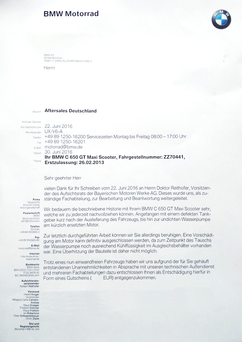 In diesem Brief stellt BMW fest, daß mein Scooter nun aber in einem einwandfreien Zustand ist. Durch einen schriftlichen