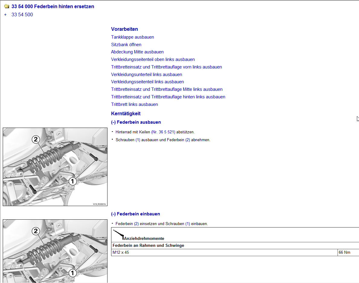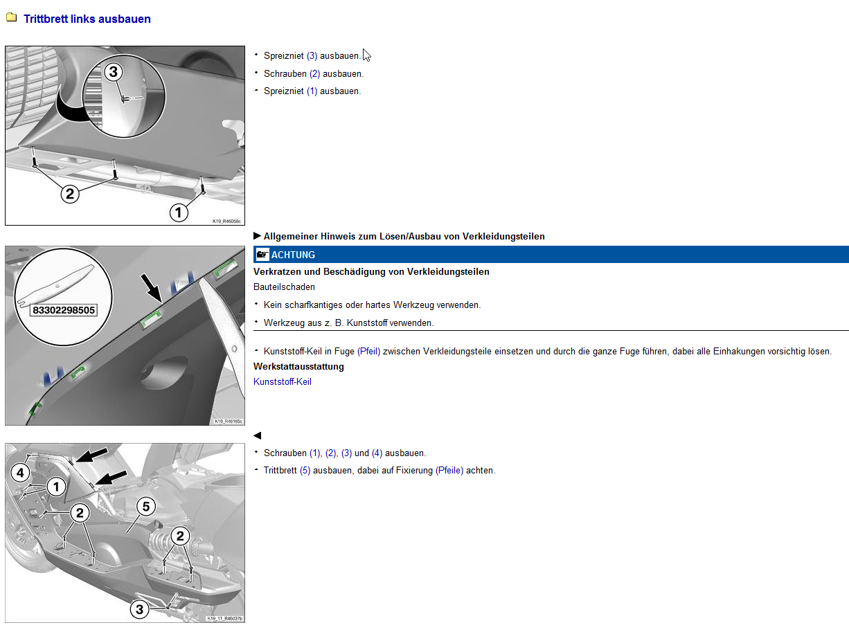 vielen Dank für die Antwort. Das Problem ist nicht die Demontage des Federbein, sondern welche Seitenteile werden wie demontiert, da gibt es so viele versteckte Schrauben