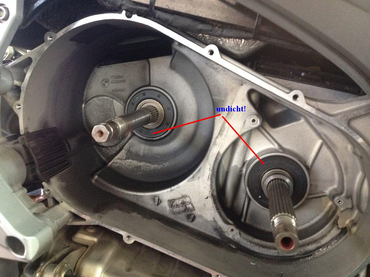 2. neue Kupplung des C650S als Ersatzteil ist frühestens in 6-8 Wochen lieferbar. Ich habe jedoch bewusst von einer Bestellung abgesehen, denn die Ursache meines "Problems" bereits lokalisiert wurde (s. Bild). Durch die Undichtigkeit an beiden Wellen ist Öl ausgetreten. Laufleistung 19.000 km. In Folge verglasten erneut die Kupplungsbeläge und der Keilriemen samt Kupplung rutschte. Die Dichtungssätze wurden konstruktiv in 2014 verändert und kosten ca. 18 + 38 EUR. Beide werden erneuert und samt neuen Kupplung in "alt" Ausführung getauscht. Parallel dazu wird eine Spring Slider (passt perfekt) und schwerere Gewichte 20,00 Gramm montiert.
