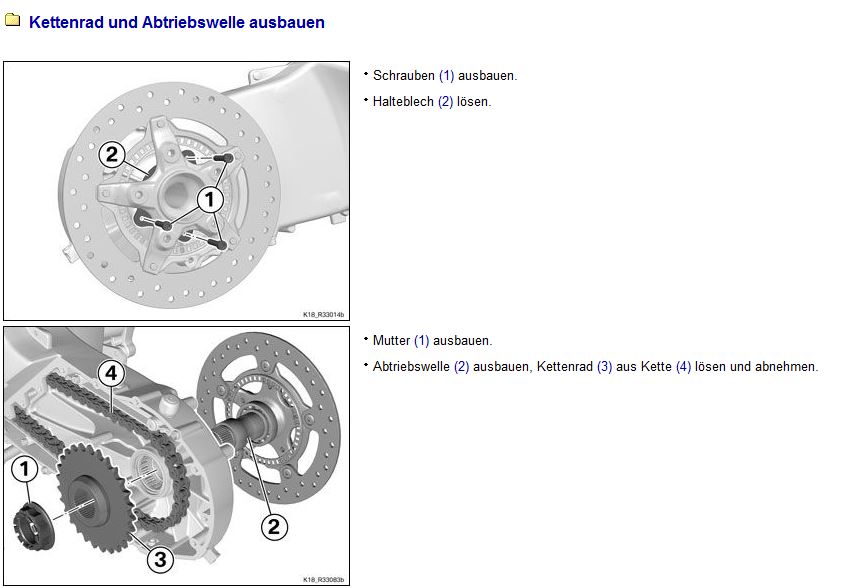 Hallo, mein Hinterrad am C 650 GT, 46.000 km, wackelt. Zum Lagertausch muss die Antriebswelle ausgebaut werden - Aber wie? Ich habe bereits alles abgebaut und die Welle liegt frei, sie müsste "nur noch" nach rechts ausgedrückt werden. Das Werkstatthandbuch sagt über dieses Thema aber nichts. Es gibt nur unter der Rubrik "Schwinge wechseln" eine Anleitung zum Aufpressen neuer Lager auf die Welle (Löse-/Fügetemperatur 80/100 Grad), aber nichts über Ein-/Ausbau der Welle. Hat jemand eine Idee?