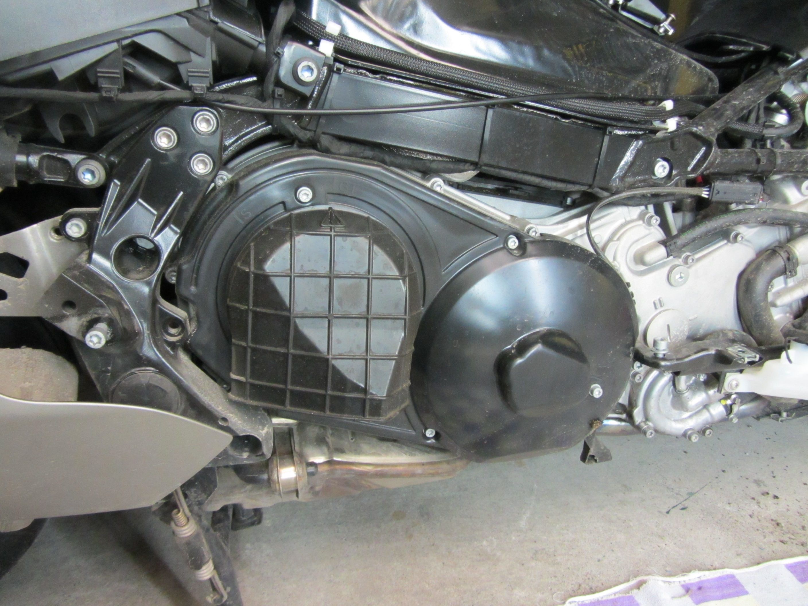 So. Nun ist der Zugang für den Luftfiltergehäusedeckel des Riemen-/ bzw. Kupplungsgehäuse (nennt man das so?) frei und dieser kann demontiert werden.