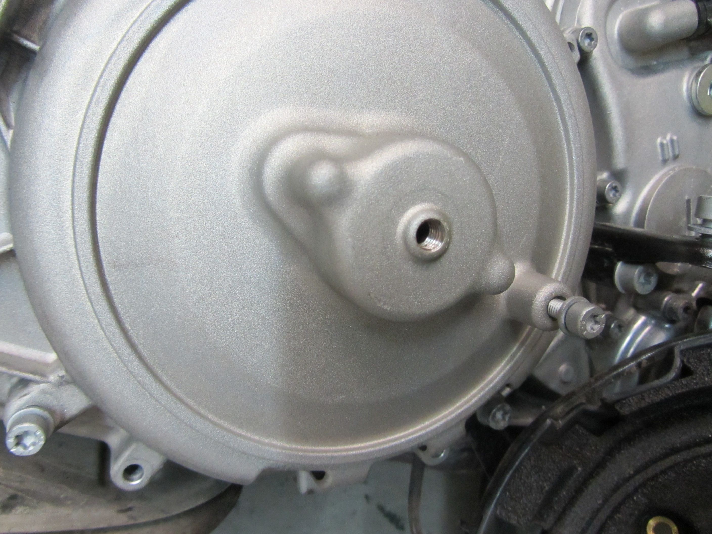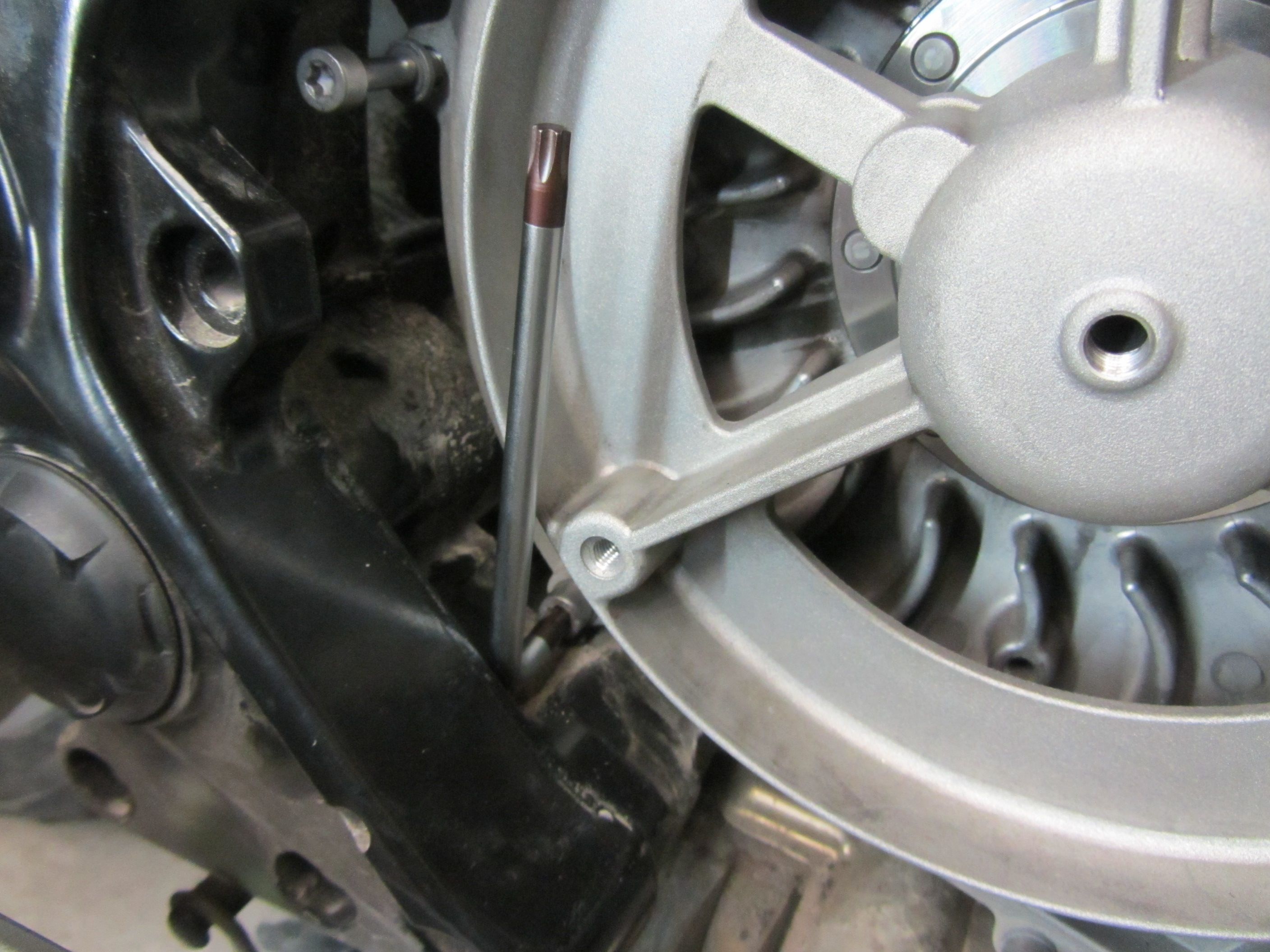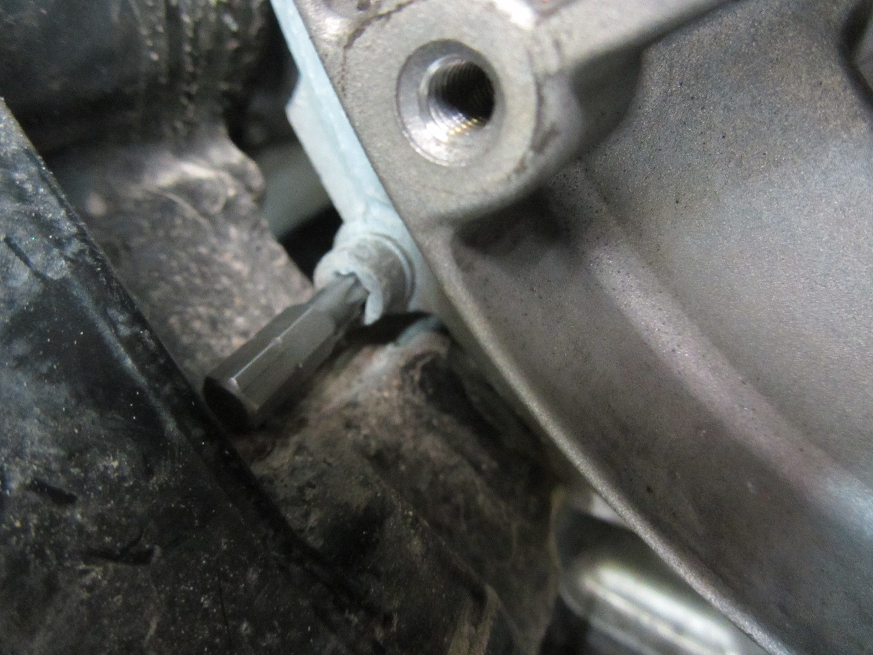 Ist man soweit, wird der Aludruckgussdeckel des Kupplungsgehäuse abgeschraubt. Dies geht eigentlich problemlos. ABER! Eine Knacknuss bilet die Befestigungsschraube links unten. Mittels üblicher Torx-Stecknuss hat man keinen Zugriff. Es ist einfach nicht genügend Platz da. Ich musste mir extra einen abgewinkelten Torxschlüssel besorgen. Auch damit war es noch eine rechte Fummelei, die Schraube zu lösen. Schlussendlich hat es dann aber doch noch geklappt.