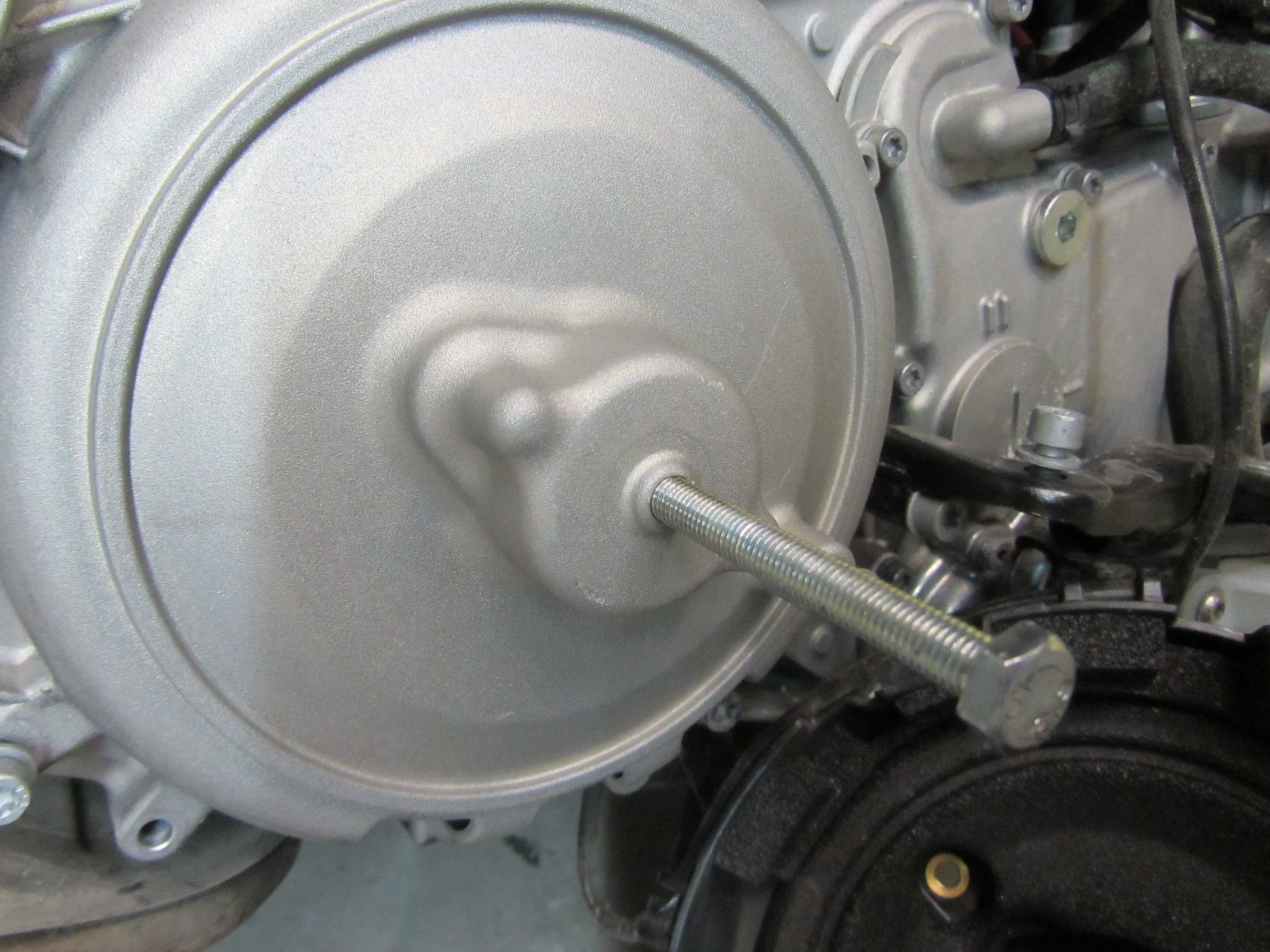 Jetzt sollte der Deckel leicht zu entfernen sein. Sollte, ging aber nicht. Bei mir bestand das Problem darin, dass sich an den Achsenden von Kupplungs- und Variomatikachse Rost gebildet hatte und somit in den Gegenlagern des Deckels festsassen. Aus diesem Grunde befinden sich zwei Gewindebohrungen im Deckel. Durch gleichmässiges Hineinschrauben von zwei langen M8-Schrauben lässt sich der Deckel dann aber leicht abziehen.