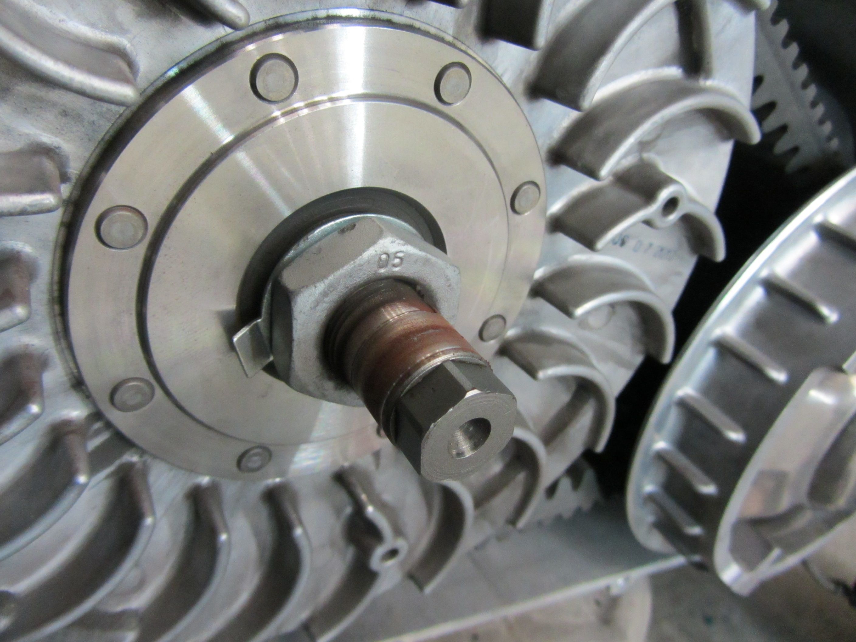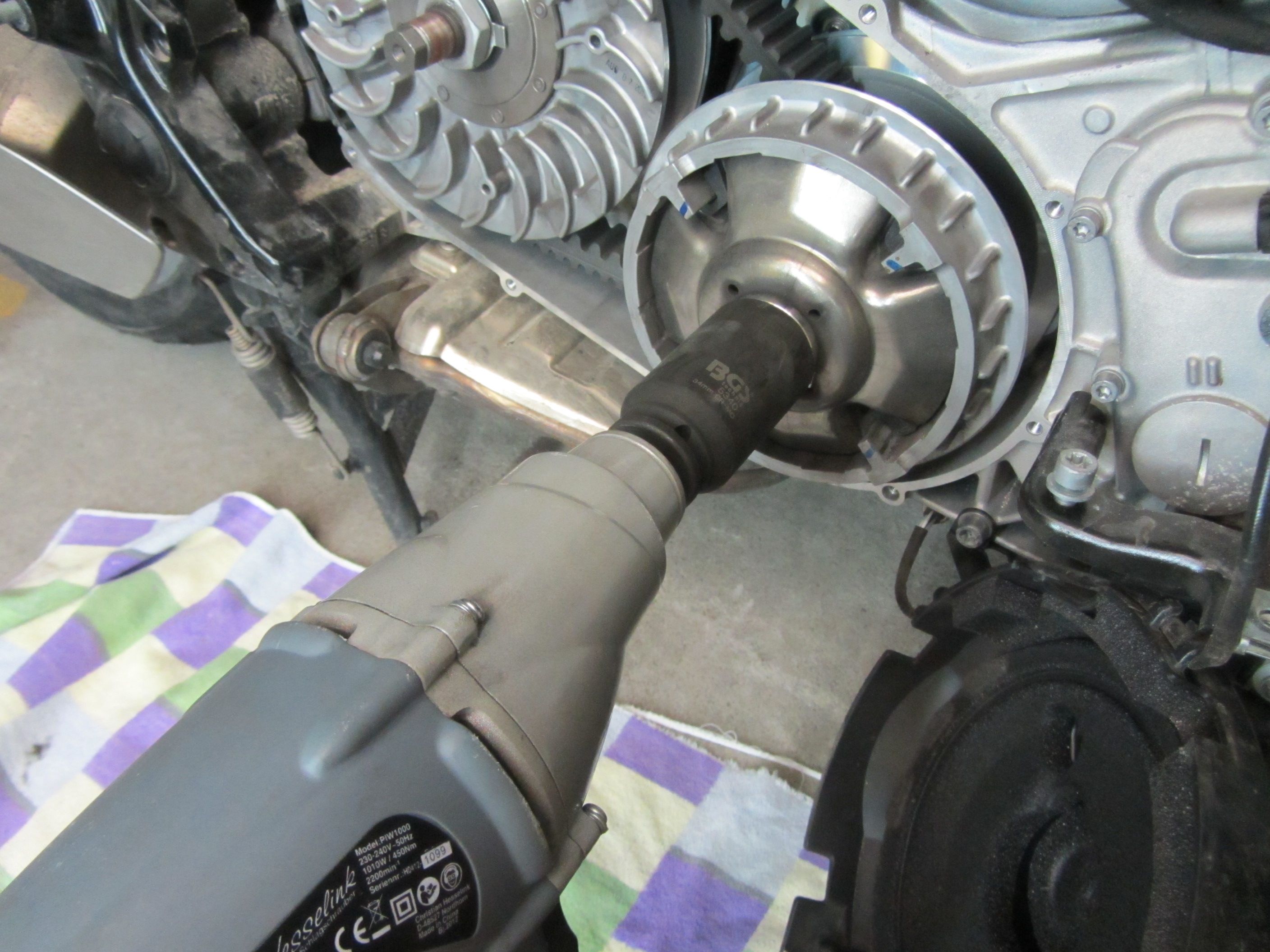 Die Muttern, mit denen die Kupplungseinheit sowie die Variomatik befestigt sind, besitzen eine Schlüsselweite von 34 mm. Man benötigt eine Stecknuss, die eine Verzahnungstiefe von mindestens 44-45 mm aufweist. Nicht vergessen, die Schraubensicherungen zu lösen! Zum Lösen der Muttern ist ein Schlagschrauber perfekt. Die Muttern sind nicht extrem dolle angezogen. Somit könnte man diese vermutlich auch mittels normalen Drehmomentschlüssel entfernen. Dazu müsste man aber das Kupplungslüfterrad und die Variomatik irgendwie festhalten bzw. blockieren können. Wie gesagt, Schlagschrauber ist besser. Man entfernt erst die Variomatikscheibe und dann die Kupplungseinheit.