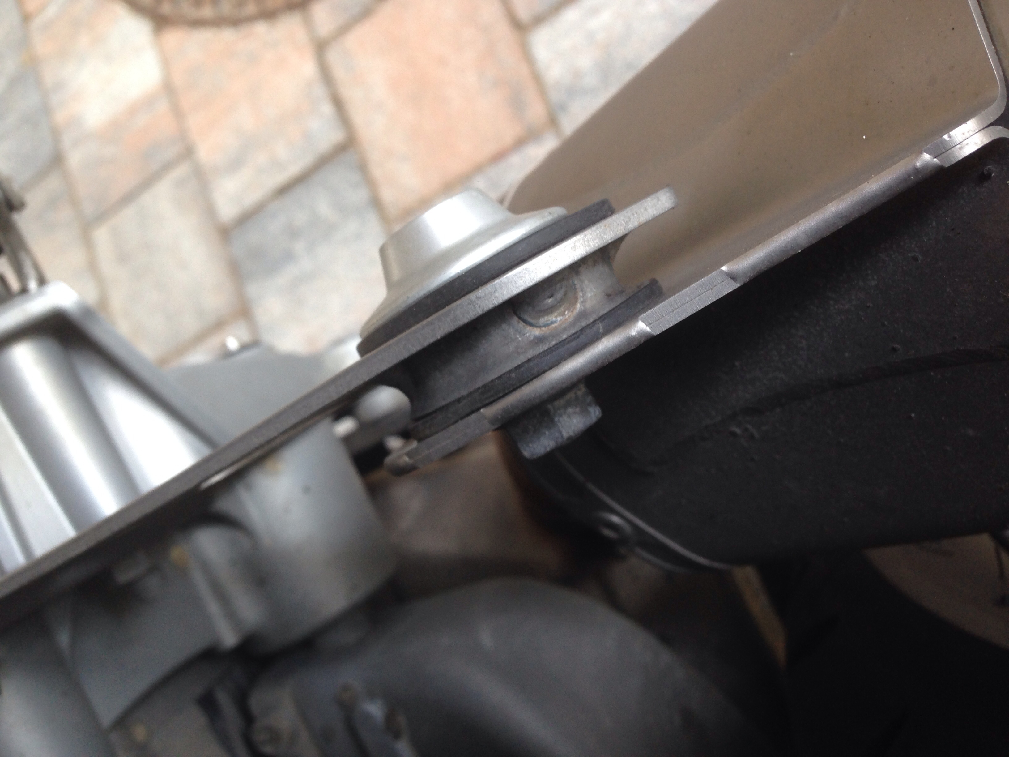 Es ist noch interessant. Wenn man etwas auf Google-Bilder stöbert sieht man, dass es zwei Möglichkeiten gibt, den Topf zu montieren. Konkret geht es um die obere Befestigungslasche des Akrapovics. Diese muss ja an den Haltebügel mit Gummimuffe am Roller angeschraubt werden. Steht man nun vor der rechten Fahrzeugseite, kann man diese Lasche entweder HINTER dem Haltebügel montieren, oder VORNE. Gemäss Akrapovic-Installationsanleitung wird der Auspuff von HINTEN an diesen Bügel angeschraubt. Guckt mal die Bilder! Ich habe das Teil von HINTEN angeschraubt.
