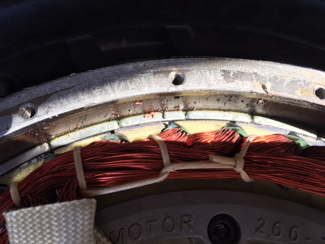 Ein E-Motor brennt durch, bekommt einen Windungsschluss. Lose Metallteile deuten auf ein mechanisches Problem hin, vermutlich ungenaue Fertigung. Stator und Rotor berühren sich nicht, und nur einer von beiden ist überhaupt in Bewegung.