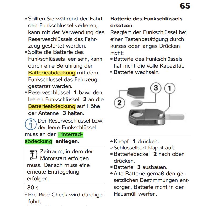 Den kleinen schwarzen Reserveschlüssel an die gleich Stelle halten und starten.