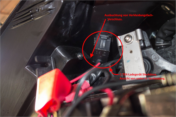 Ich mache das so: CTEK Buchse rechts eingebaut (mit Dremel ein Loch geschnitten)