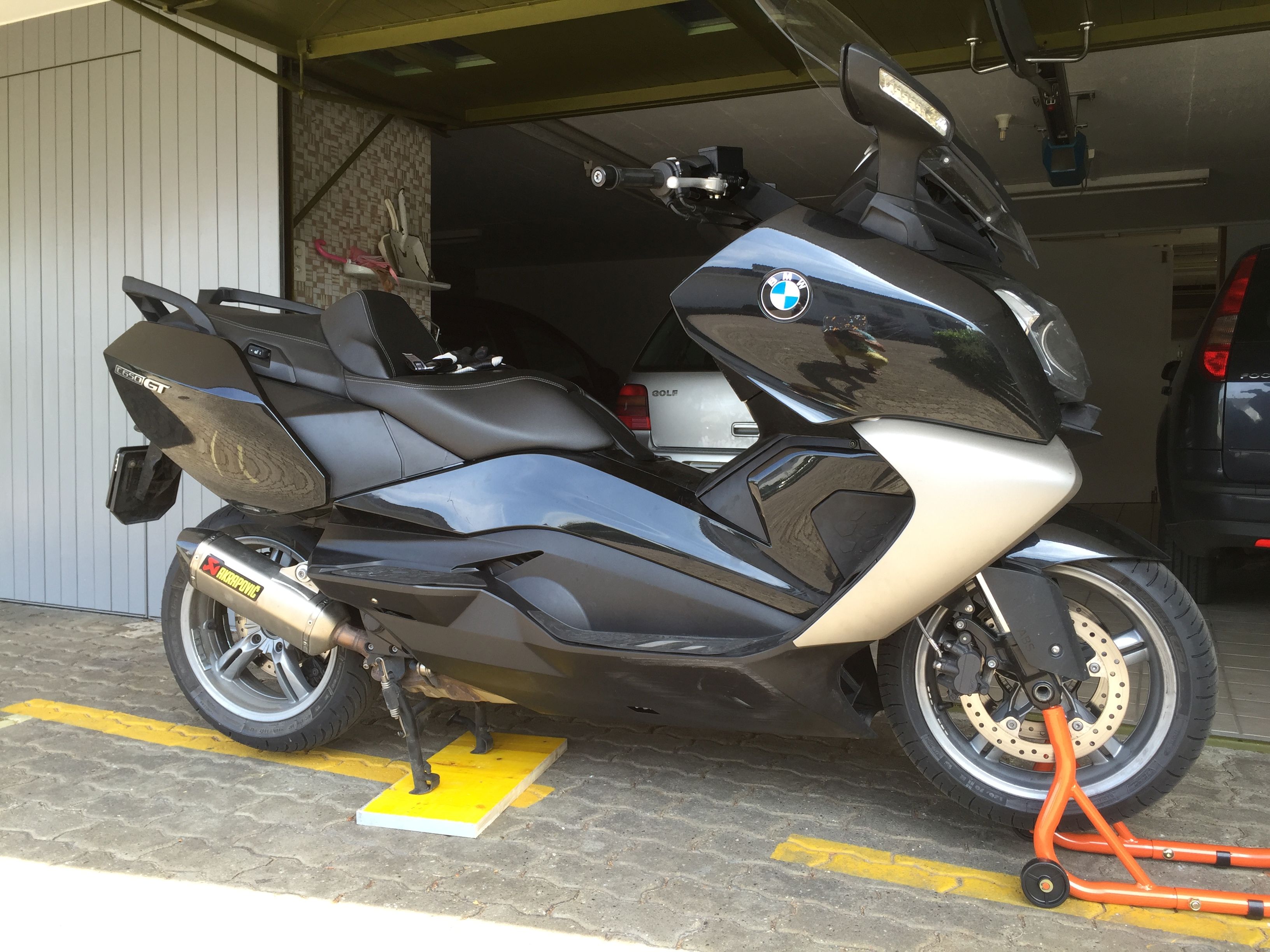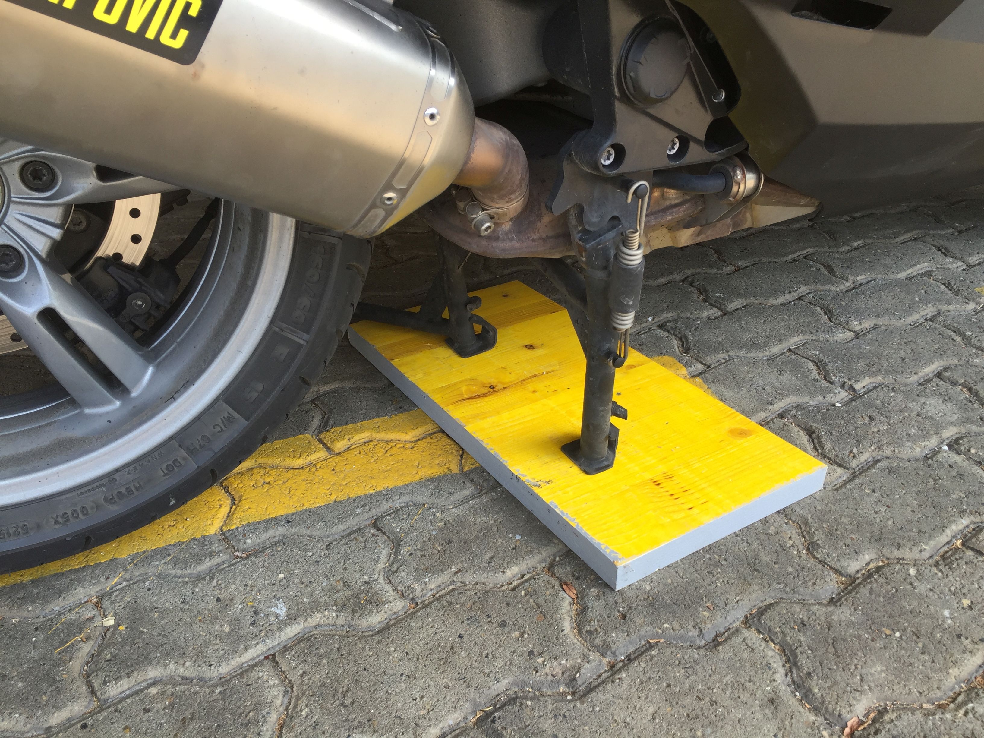 Bei C600sport kann man das Vorderrad ohne Holz unter den Hauptständer wechseln. Allerdings steht er dann hinten so gut wie auf.