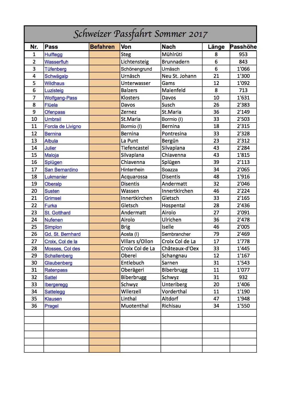 Es werden 36 Pässe in der Schweiz gefahren, davon 16 Pässe über 2000 meter.
