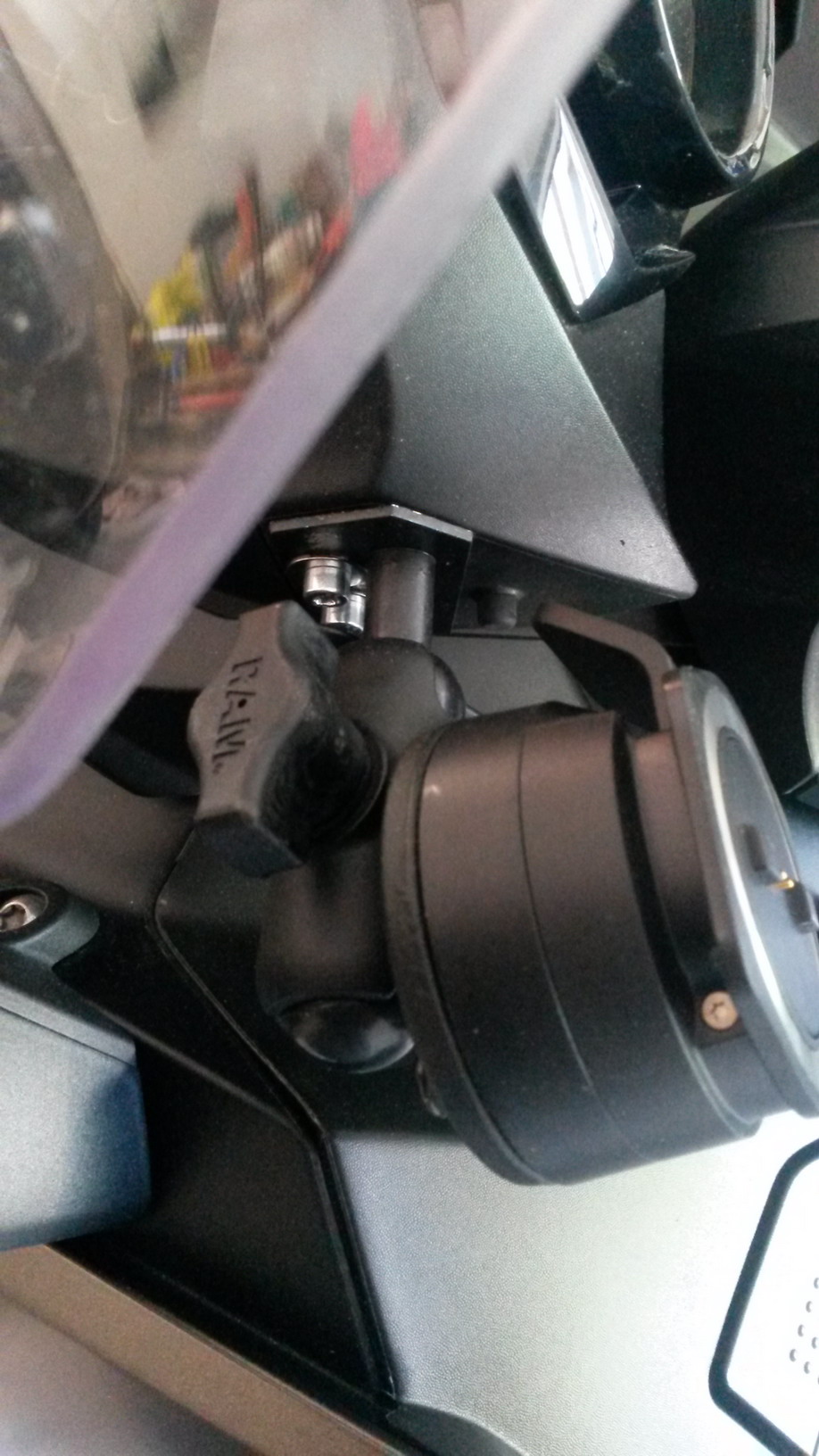 Unter den beiden Seitenwindflügelchen befinden sich 2 Schrauben, die die Instrumentenverkleidung befestigt. An dieser Stelle ist die Halterung positioniert. Ein erster Versuch an nur einer Schraube die RAM-Halterung anzuschrauben brachte nicht den gewünschten Erfolg, da das Gewicht und der Hebelarm zu groß war und das ganze System mir viel zu sehr wackelte. Die Kraftübertragung auf die Kleine Zylinderfläche der RAM-Halterung war einfach zu groß. Also habe ich mir eine 2 mm Stahlblechplatte mir vom Schlosser meines Vertrauens „schnitzen“ lassen mit 2 Bohrungen. So wir die Kraft aus dem Hebelarm mit Gewicht Navi wesentlich besser verteilt. Ursprünglich wollte ich die RAM-Halterung am Zylinderschaft abschrägen und an die Stahlplatte schweißen lassen. Da es sich aber um 2 verschiedene Materialien handelt, schied eine Verschweißung aus. Wir haben dann eine weitere Bohrung mit einer kegelförmigen Senkung vorgenommen, so dass die Senkkopfschraube von hinten flächenbündig mit der Stahlplatte ist. RAM-Halterung an die Platte geschraubt, Originalschrauben raus, Platte mit RAM-Halterung mittels 2 Innensechskantschrauben angeschraubt und fertig ist die Halterung. Anschl. das TomTom-Kabel gekappt, Kabel durch die Verkleidung geführt und mit dem im Lenker befindlichen Anschluss verbunden.