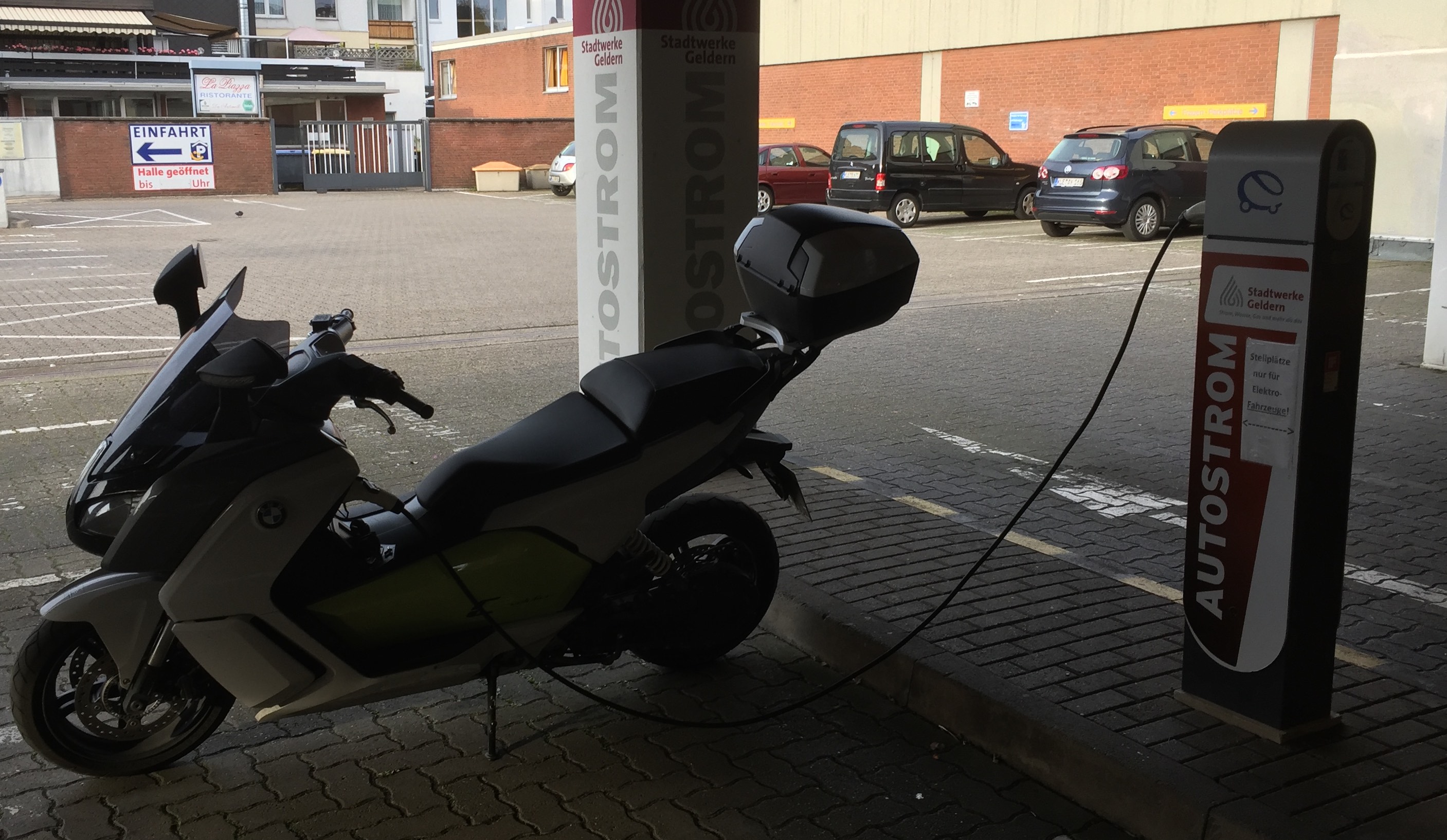 Das erste Etappenziel war dann Geldern hinter Wesel. Kleinstadt mit immerhin einer Ladesäule. Dank den Stadtwerken war das Tanken sogar Kostenlos. Die Ladestation war leider in einer geschlossenen Parkeinrichtung, ich konnte mich aber durch mogeln. Allerdings habe ich die Stadt um die Parkgebühr geprellt. Angekommen mit 3% Restladung und 103 km Fahrt. Tankzeit ca. 2h10 min um die 80 % aufzufüllen.Es sollten ja auch nur noch 65 km sein und das kann man ja bei vorsichtiger Fahrweise locker schaffen.
