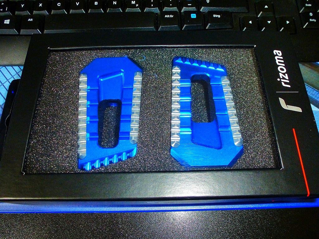 nach den blauen Lenkerenden möchte ich auch die Fußrasten als Eye-Catcher in blau. Bisher fand ich nur die Rizoma-Alurasten in blau mit passendem Adaptergelenk für den C 600. Sollten aber beim C evo auch passen.