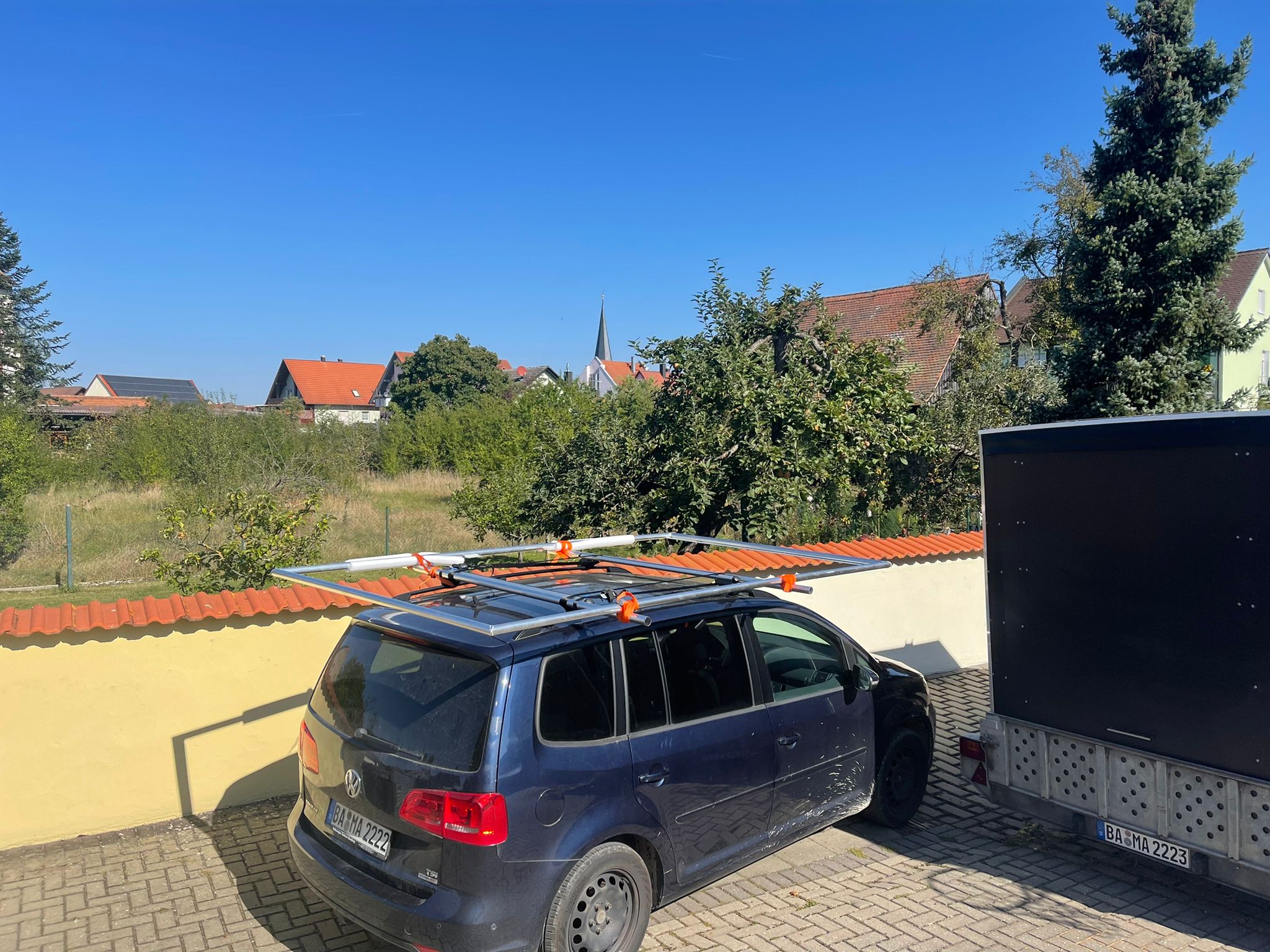 Unterkonstruktion ist schon mal fertig und ich weiß, ich weiß … ein schlechtes Beispiel für Ladungssicherung aber die 4kg Alurundrohr waren Bombenfest!