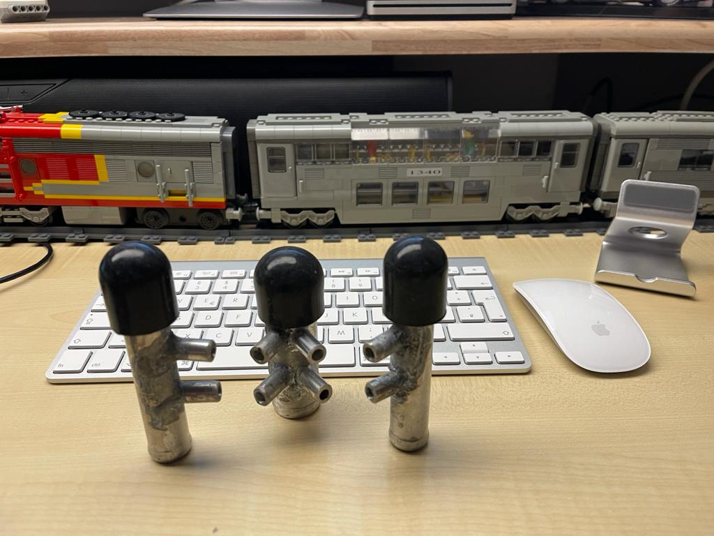 Habe nochmal den mittleren Wasserverteiler überarbeiten lassen, nun hat er 4 Ausgänge, je zu einem Behälter der elektrischen Zusatzkühlung via Peltier-Element.