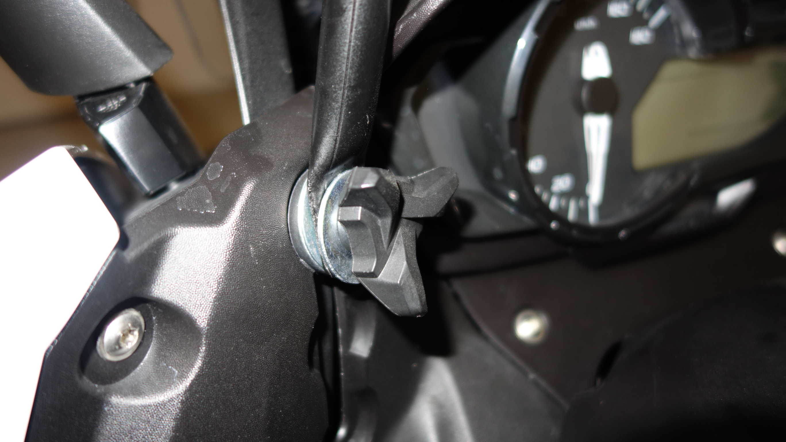 Klemmbacken und Adapterplatte verwendete ich von der BMW-Halterung. Als Befestigung dienen die beiden Klemmschrauben zur Verstellung der Neigung des Windschildes. Als Bügel dient ein Aluminiemrohr, das ich angepasst biegen konnte.Der Stromanschluss kommt diekt von der Batterie. Ausserdem habe ich den Stromanschluss der versteckten Steckdose im linken Handschufach umhängen lassen direkt auf Batterie. Somit kann ich mein vorhandenes Batterieladegerät zu Aufladen verwenden.