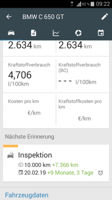 Im Feb. 2018 die Einfahrkontrolle mit 832 km durchführen lassen. Die Eintragungen für die nächste Wartung wurde seitens BMW auf den 20.2.2019 oder 10.832 km vorgenommen.