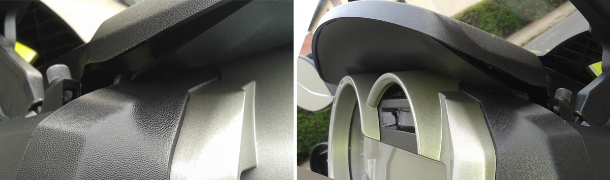 Nach einem Tipp von einem GT-Fahrer beim Walsroder Rollertreffen (9. Mai ´15) hab ich mal alles auseinander genommen und neu zusammen gesetzt. Die untere Schale des Daches sitzt üblicherweise in 3 Zung_en der obereren Schale. Und das ist bei mir herausgesprungen*. Um es wieder einzusetzen, muß man allerdings etwas schrauben, was aber am GT keine große Sache ist und weitgehend** mit dem Bordwerkzeug, respektive dem Torx-Schraubendreher geht: