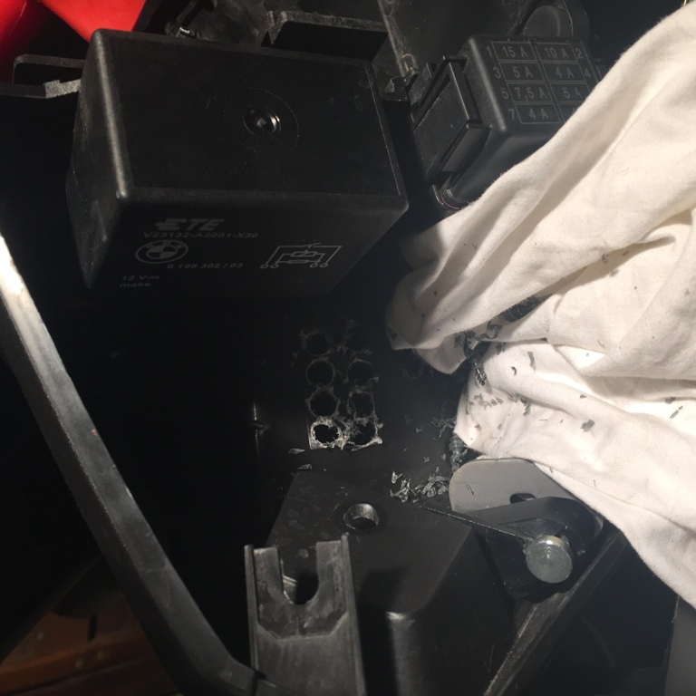 5 Löcher (1 für die USB-Steckdose und 4 für die CTEK-Steckdose) mit meinem Drehmel gebohrt. Danach mit einem Hochgeschwindigkeit Fräser und dem Dremel die Öffnungen passend gefräst und die Kanten mit einer Schlüsselfeile entgratet.