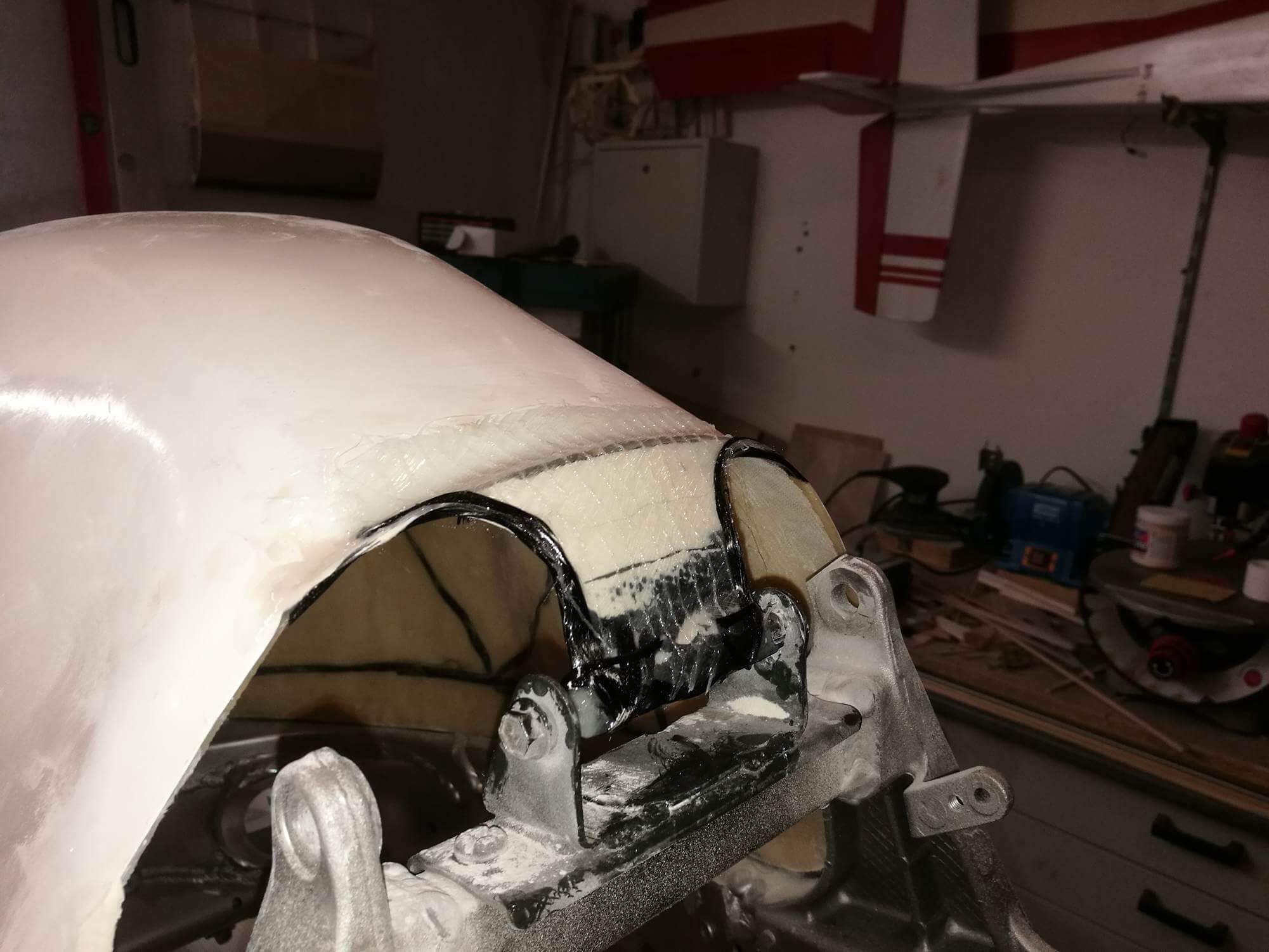 Damit es nicht weiß durch die Carbonmaatte durschimmert, wurde die GFK-Tankattrappe kurzerhand Schwarz lackiert.