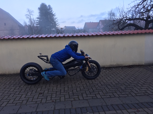 Schön zu sehen ist das ich jetzt schon (ohne „Tankabdeckung“) relativ weit die Arme nach vorne strecken muss, um an die Stummellenker zu kommen.