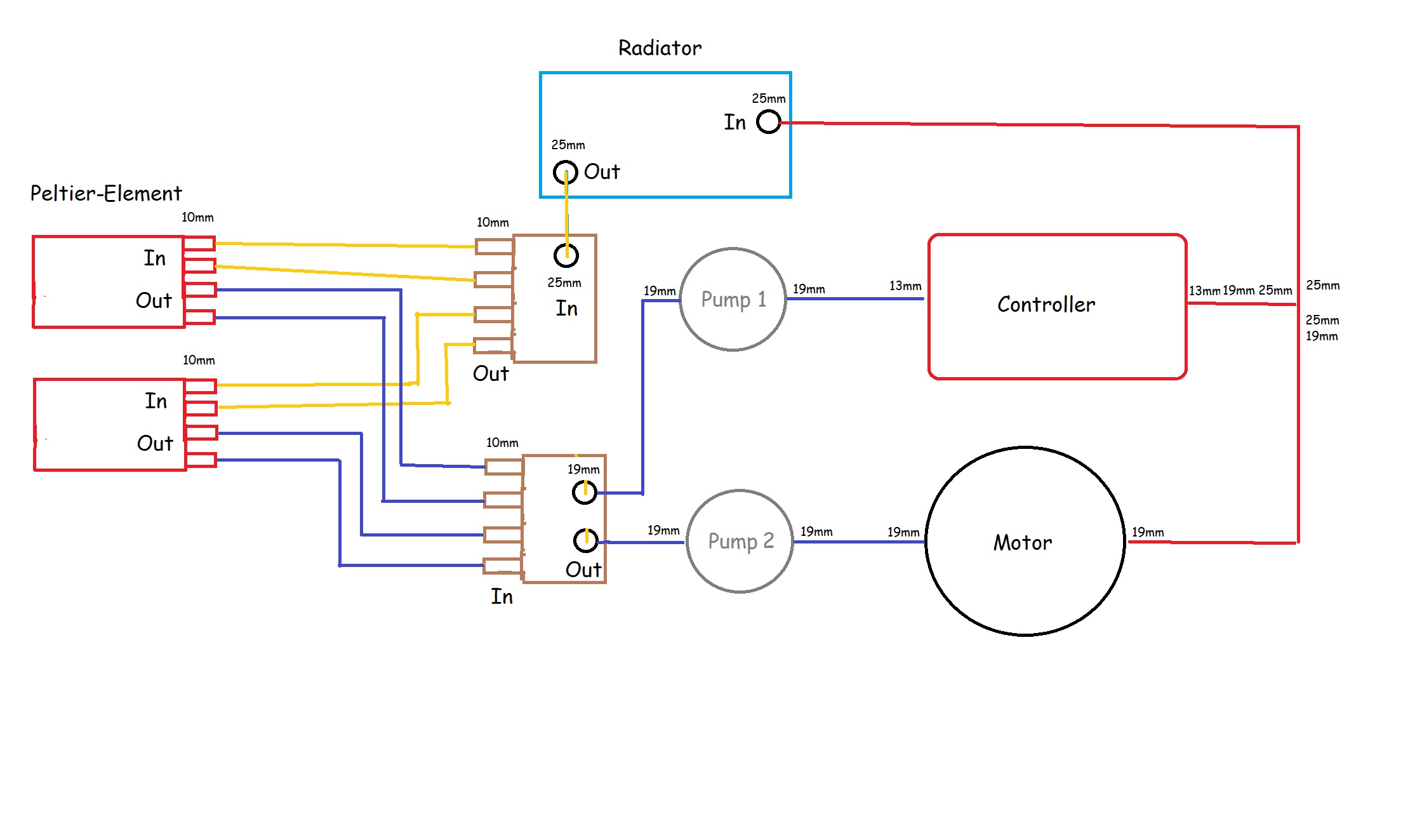 Dann folgt der kompliziertere Teil: Vom Wasserkühler zu den zwei Peltier-Kühlern über die zwei Pumpen zum Regler und zum Motor.