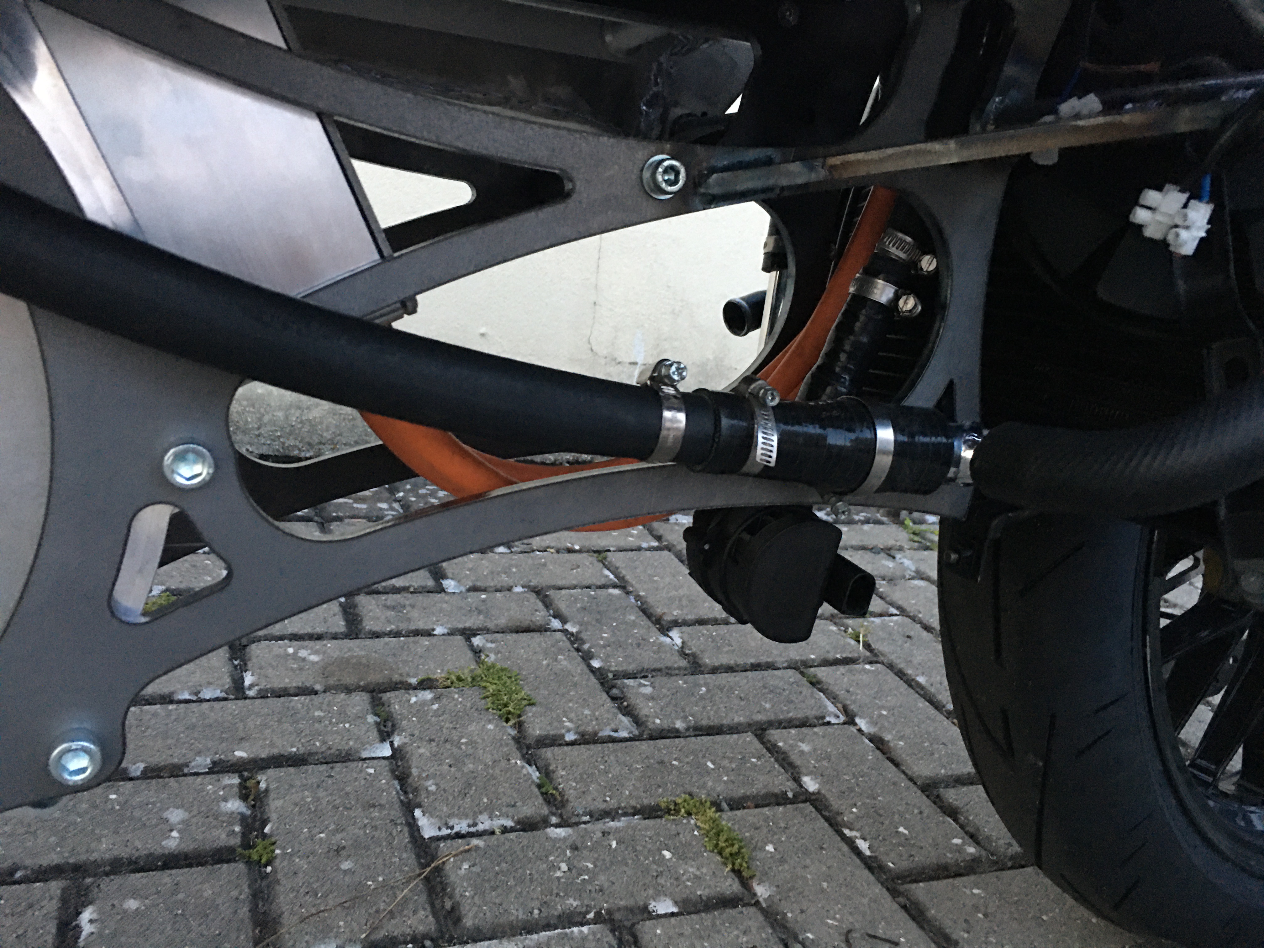 Hier habe ich die Wasseranschlüsse am Motor (Eingang/Ausgang) wieder umgedreht und den Rückführungsschlauch nochmals gekürzt.